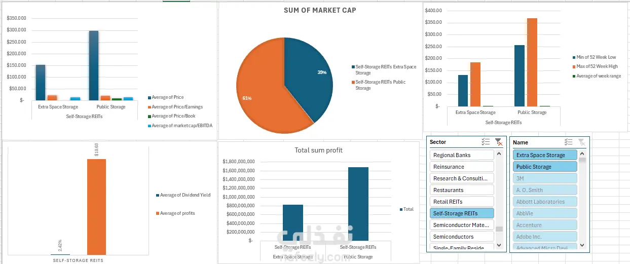 🗂️ مكونات المشروع 1. الورقة الأولى – constituents-financials تحتوي على البيانات المالية الأولية للشركات: السعر (Price) الأرباح (Profits) العائد النقدي (Dividend Yield) القيمة السوقية (Market Cap) نسب مالية: P/E, P/B, Market Cap/EBITDA روابط مباشرة لتقارير الشركات في SEC. 📌 الهدف: توفير قاعدة بيانات مالية دقيقة للتحليل الكمي. 2. الورقة الثانية – pivottable تم إنشاء جداول محورية لتجميع وتحليل البيانات حسب القطاع. تُظهر الجداول المتوسطات والمجاميع لـ: السعر ونسب الأداء المالي (P/E, P/B) الأرباح والعائد النقدي عدد الأسهم والأرباح الصافية (Net Profit) 📌 الهدف: تمكين المقارنة بين القطاعات والشركات بسرعة ودقة. 3. الورقة الثالثة – charts تضم مجموعة من الرسوم البيانية التوضيحية، منها: 📉 رسم عمودي: مقارنة بين شركتي Extra Space Storage وPublic Storage من حيث: متوسط السعر نسبة السعر للأرباح (P/E) السعر للقيمة الدفترية (P/B) القيمة السوقية إلى الأرباح التشغيلية (Market Cap/EBITDA) 🥧 رسم دائري (Pie Chart): يوضح النسبة المئوية لمساهمة كل شركة في القطاع: Extra Space Storage: حوالي 39% Public Storage: حوالي 61% 📈 رسم عمودي إضافي: يعرض الحد الأدنى والأعلى لسعر السهم خلال 52 أسبوعًا (52-Week Low / High). 💰 رسم للأرباح الإجمالية (Total Sum Profit): يُظهر أن Public Storage تحقق أرباحًا إجمالية أعلى من Extra Space Storage. 📊 رسم العائد النقدي مقابل الأرباح: مقارنة بين متوسط العائد النقدي (Dividend Yield) ومتوسط الأرباح. 🎛️ أدوات تفاعلية (Slicers): تمكن المستخدم من تصفية البيانات حسب: القطاع (Sector) اسم الشركة (Name) 📌 الهدف: تقديم لوحة معلومات (Dashboard) تفاعلية تسمح بالتحليل البصري السريع للأداء المالي.