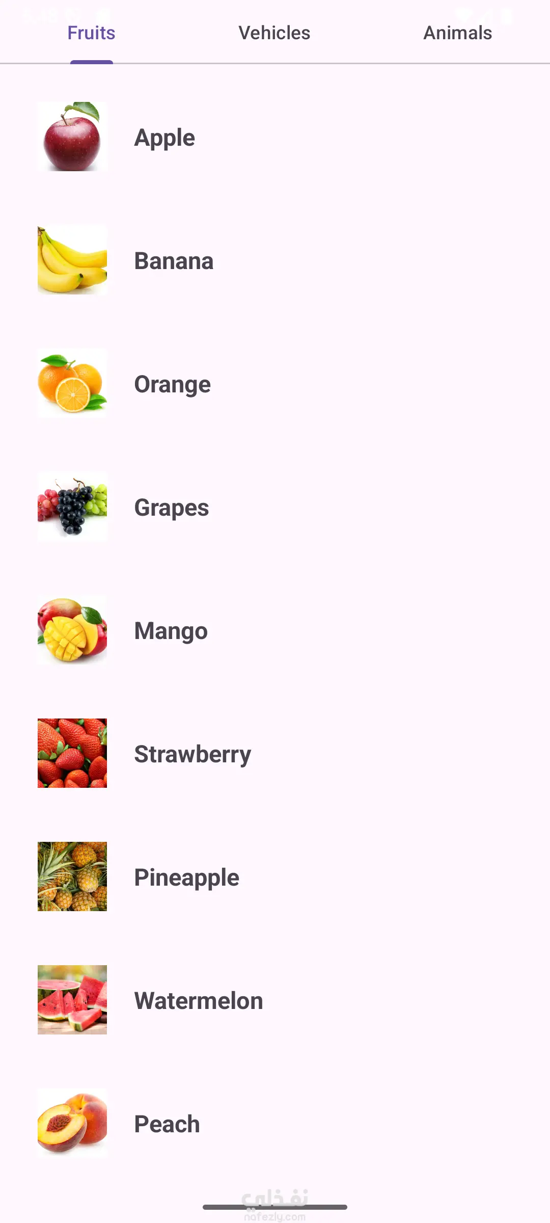 قمت بتطوير تطبيق أندرويد تعليمي/ترفيهي يحتوي على 3 أقسام رئيسية (فواكه – مركبات – حيوانات) باستخدام Tabbed Navigation لسهولة التنقل. كل قسم يعرض قائمة تفاعلية تضم أكثر من 10 عناصر، ومع كل ضغطة يتم تشغيل مؤثر صوتي خاص بالعنصر المختار لزيادة التفاعل. الأدوات المستخدمة : XML Layouts RecyclerView, TabLayout, ViewPager2 Fragments (Modular Design) MediaPlayer API