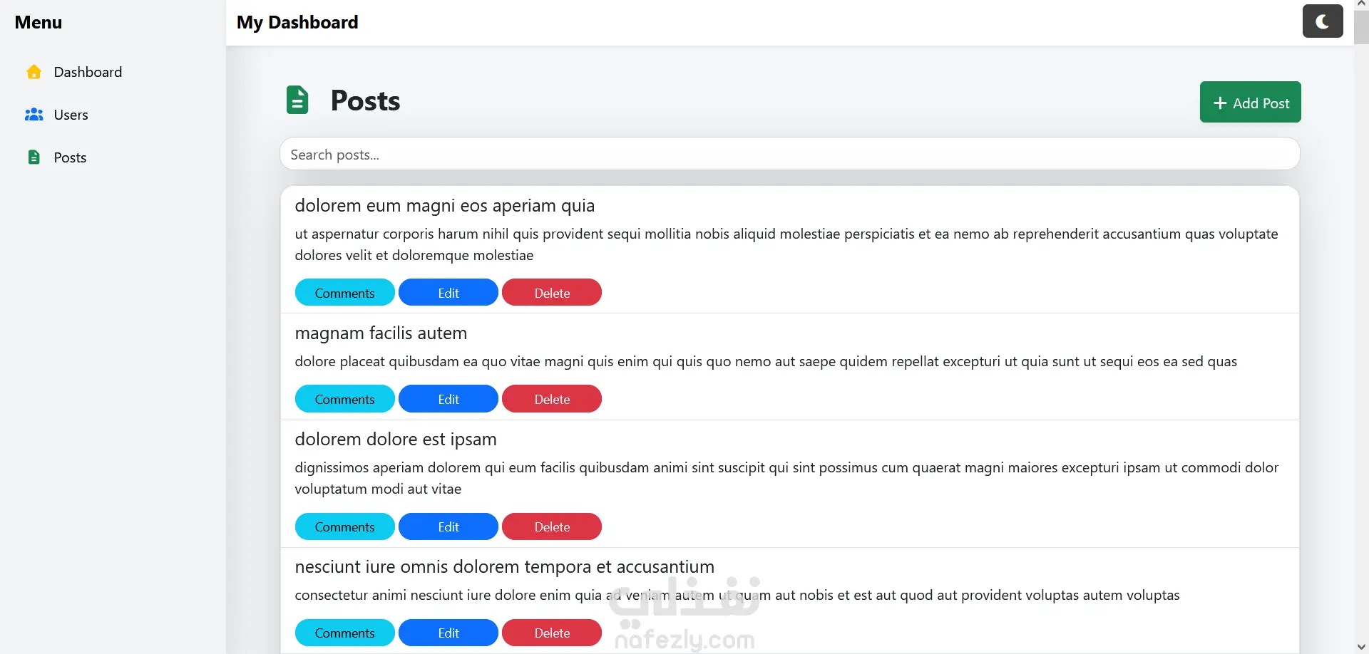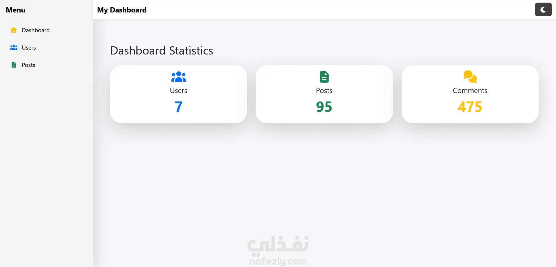 Centralized Dashboard: Displays statistics for users, posts, and comments.