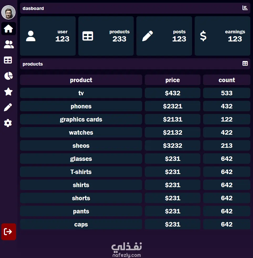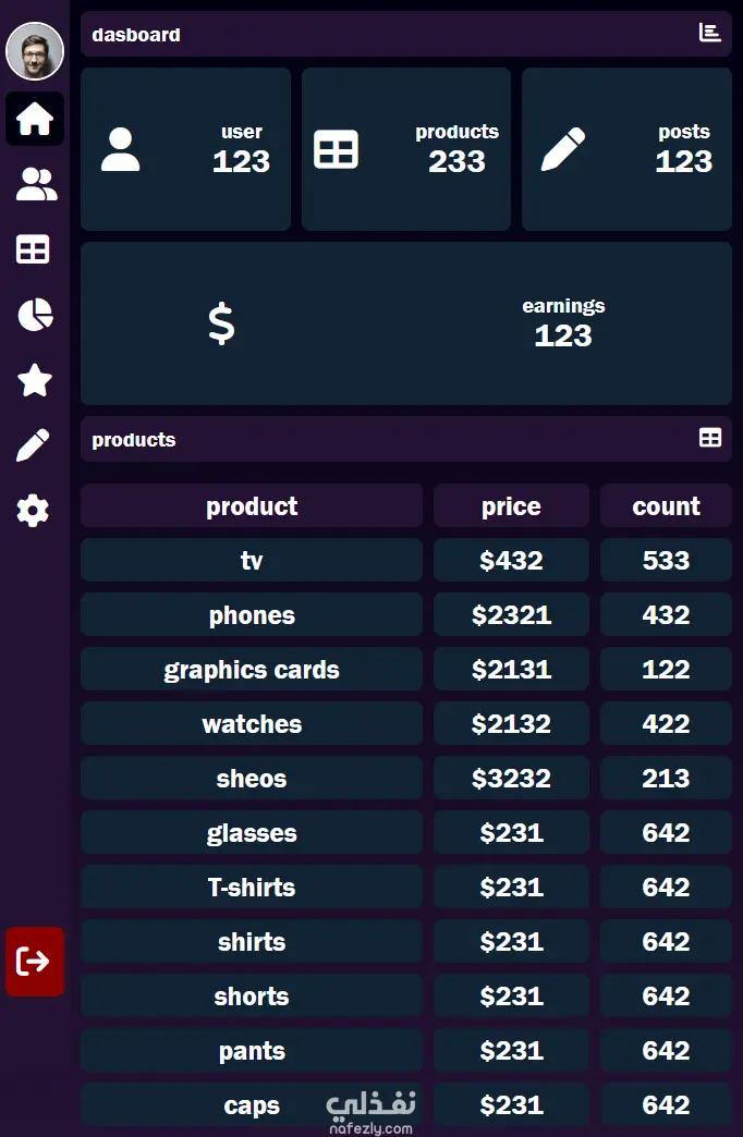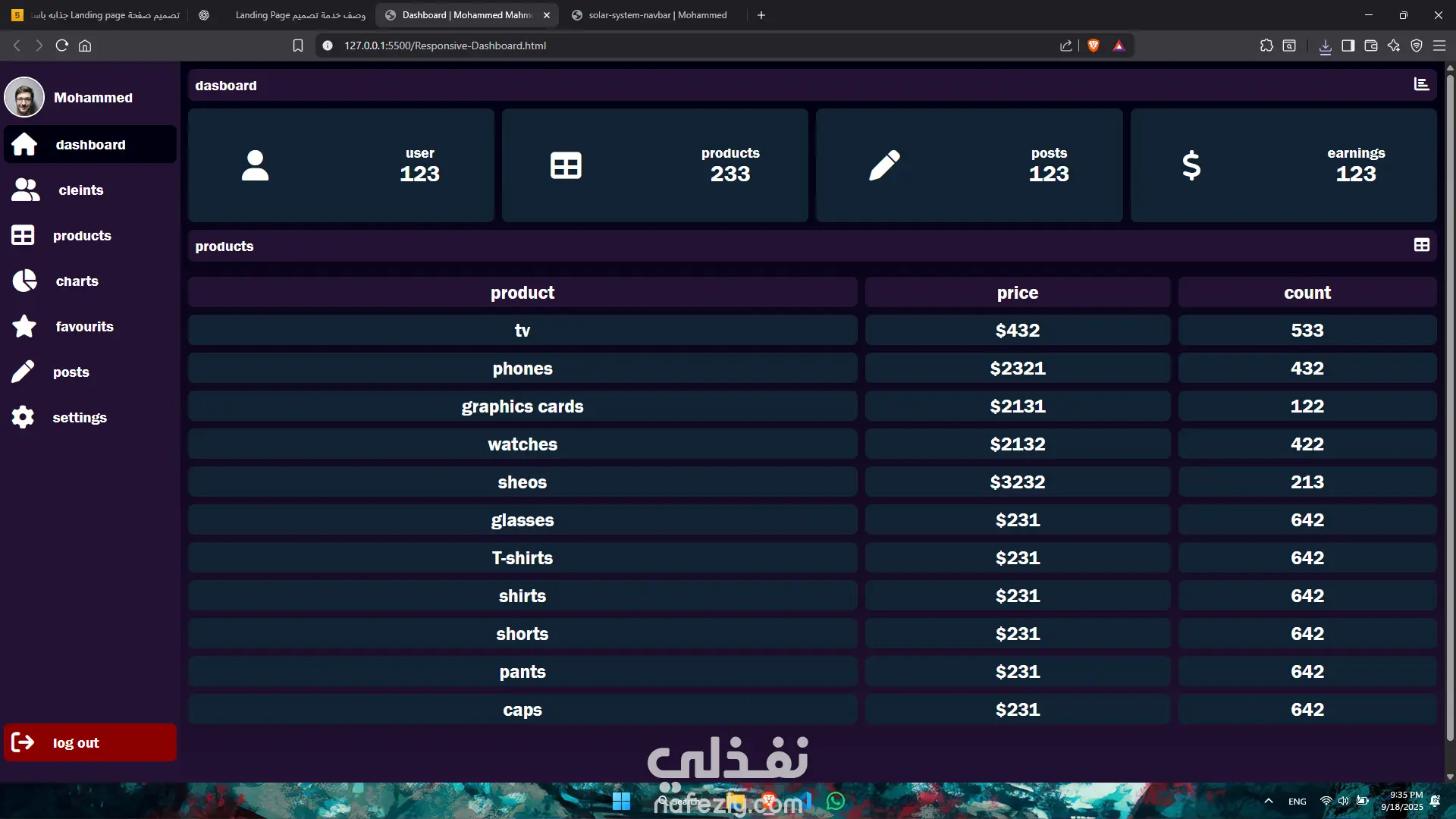 قمت بتصميم واجهة Dashboard احترافية لإدارة البيانات باستخدام HTML و CSS بتصميم عصري وألوان متناسقة تمنح تجربة استخدام مريحة وواضحة. الهدف من المشروع هو إنشاء لوحة تحكم بسيطة وسلسة تسمح بعرض المعلومات بشكل منظم وسهل القراءة، مع توزيع العناصر بطريقة احترافية توصل الإحساس بالتنظيم والدقة. العناصر الرئيسية في التصميم: شريط جانبي (Sidebar) يحتوي على الأقسام الأساسية مثل: Dashboard، Clients، Products، Charts، Favourites، Posts، Settings. قسم علوي (Header Cards) يعرض إحصائيات سريعة مثل عدد المستخدمين، المنتجات، المنشورات، والأرباح. جدول تفصيلي (Products Table) يعرض قائمة المنتجات مع السعر وعدد الوحدات بشكل منظم وواضح. تصميم متدرج الألوان (Gradient Theme) يعطي مظهرًا حديثًا واحترافيًا مع لمسة داكنة أنيقة. زر تسجيل خروج (Logout Button) بارز وواضح بتصميم عملي وسهل الوصول. النتيجة: واجهة Dashboard متجاوبه و أنيقة ومنظمة، مناسبة للمشاريع الإدارية أو الأنظمة البسيطة التي تحتاج عرض بيانات بطريقة جذابة وواضحة.