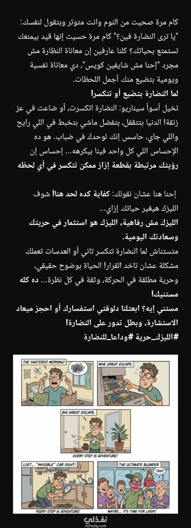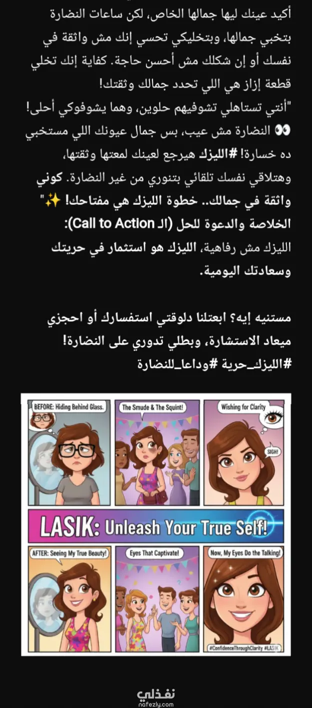 اتكلمنا هنا عن اهم المشاكل اللي بتواجهنا مع النضاره وضعف الابصار من كسر النضاره لضياعها وازاي ممكن تأثر على نشاطنا وعدم قدرتنا على ممارسة الرياضة وازاي ممكن تأثر على الشكل والجمال وخصوصا عند البنات واتكلمنا عن ازاي الليزك بيقضي على كل المشاكل دي وبيخلينا نعيش حياتنا براحه وثقه