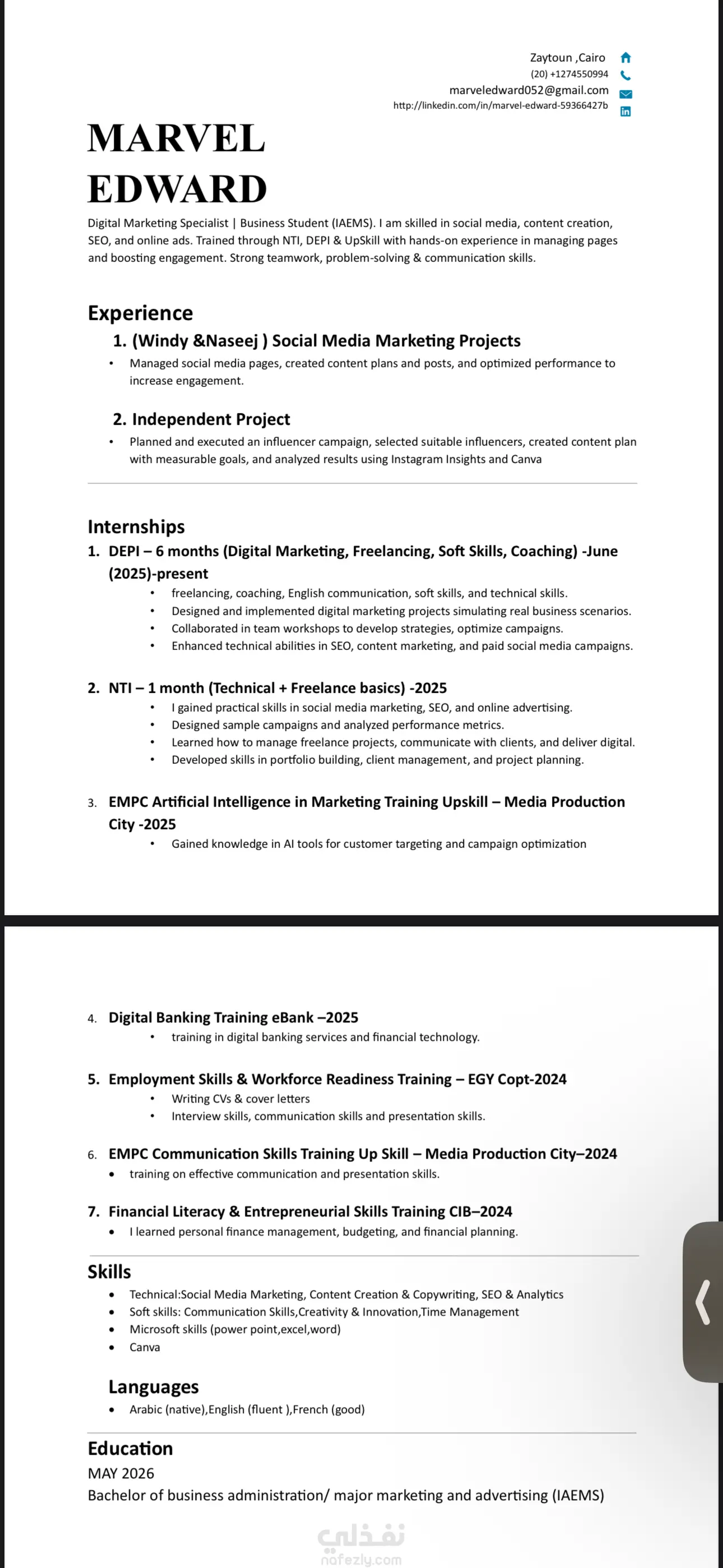 كتابة سيرة ذاتية احترافية باللغة العربية أو الإنجليزية. تصميم حديث ومنسق يظهر مهاراتك وإنجازاتك بوضوح. توافق كامل مع أنظمة ATS لضمان ظهور سيرتك في نتائج البحث. تنسيق مناسب لأي مجال (تسويق، هندسة، خدمة عملاء، طلاب، خريجين جدد...). تحسين الصياغة لتكون جذابة ومقنعة لأصحاب العمل