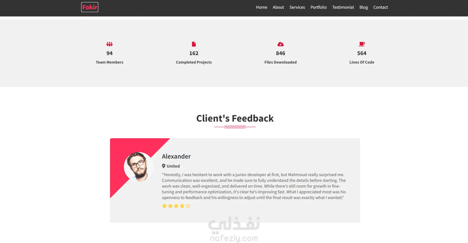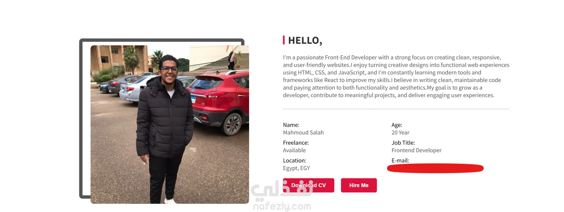 موقع شخصي (Portfolio) تم تصميمه وتطويره بالكامل باستخدام HTML, CSS, وJavaScript مع التركيز على أن يكون متجاوب (Responsive) على مختلف الأجهزة. الموقع بيعرض: قسم تعريفي للتعريف بالمطور ومهاراته. خدمات واضحة مثل UI/UX Design، تطوير التطبيقات، وتصميم المنتجات. معرض أعمال (Portfolio) لعرض نماذج المشاريع. قسم آراء العملاء (Testimonials) يعرض التقييمات. مدونة لعرض المقالات أو الأخبار. نموذج تواصل (Contact Form) للتواصل بسهولة. الهدف من الموقع هو تقديم هوية رقمية احترافية لمطور واجهات أمامية، تجمع بين البساطة والجاذبية، وتظهر المهارات بشكل منظم يساعد العملاء على التعرف على خبراته وخدماته بسرعة.