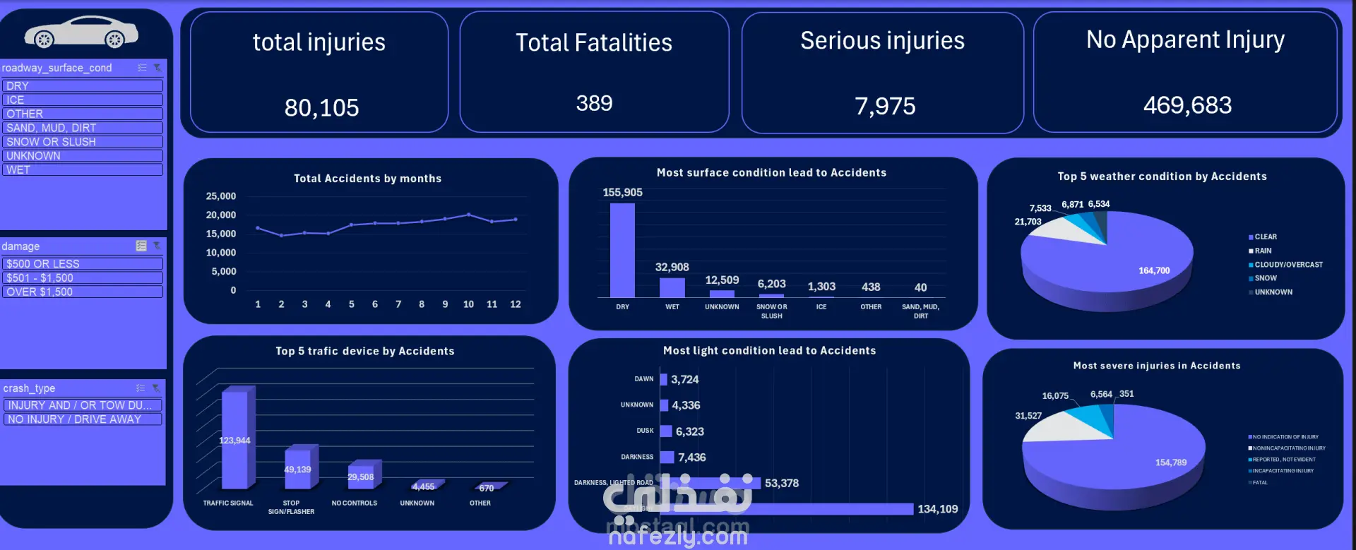 قمت بالعمل على بيانات خاصة بحوادث المرور، حيث بدأت بعملية تنظيف ومعالجة البيانات باستخدام Python لضمان جودتها والتخلص من الأخطاء والتكرارات. بعد ذلك أنشأت لوحة معلومات (Dashboard) باستخدام Excel توضح أهم المؤشرات مثل: إجمالي الإصابات، الإصابات الخطيرة، وعدد الوفيات، توزيع الحوادث حسب الأشهر، تأثير حالة الطريق (جاف، مبتل، جليد، .....) على عدد الحوادث، أكثر ظروف الطقس والإنارة المسببة للحوادث، وأكثر الأجهزة المرورية (إشارات المرور، إشارات التوقف، ....) المرتبطة بالحوادث. الهدف من هذا التحليل هو تقديم صورة شاملة عن أسباب الحوادث وظروفها، مما يساعد في وضع استراتيجيات للحد منها وتحسين السلامة المرورية.