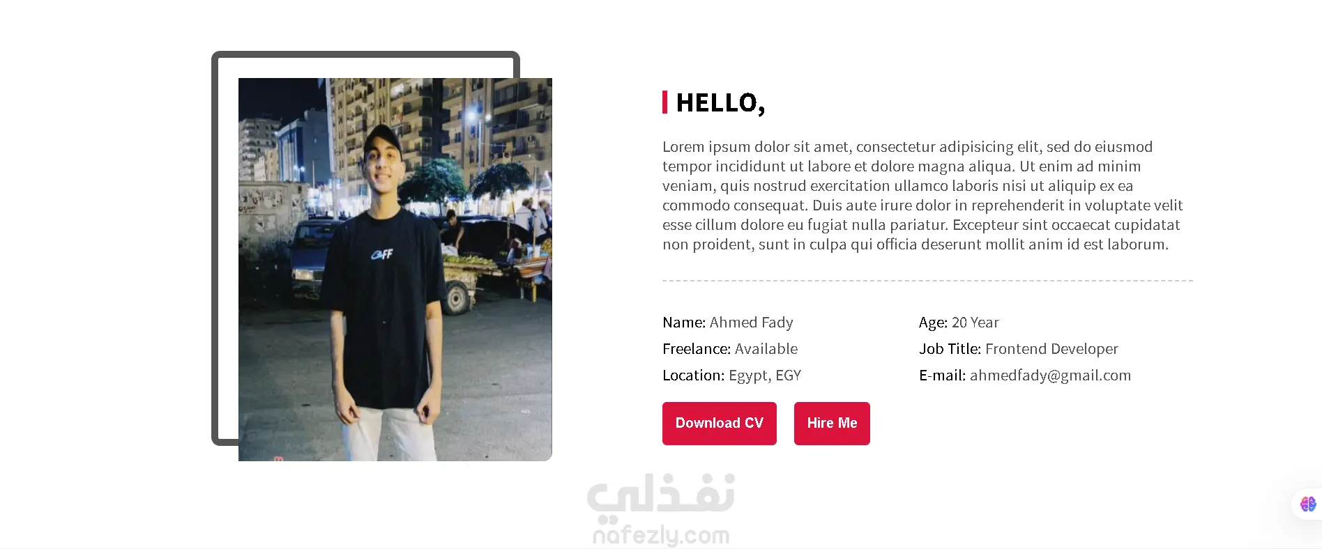 يوجد زرّ لتحميل السيرة الذاتية “Download CV / Hire Me”