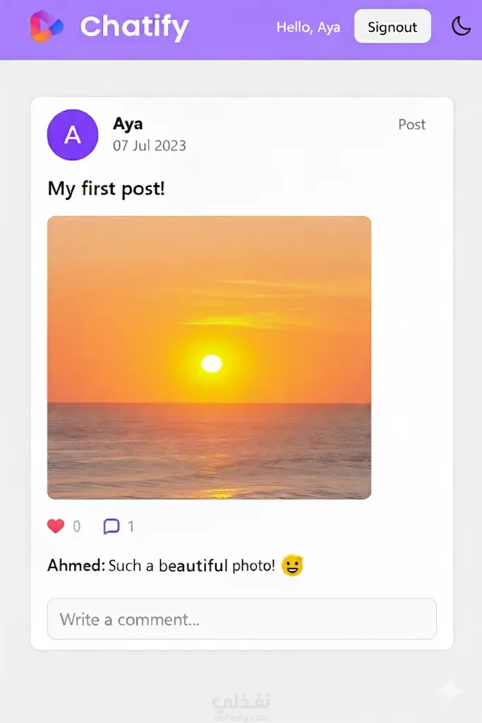 Chatify هو موقع تواصل اجتماعي عصري تم بناؤه باستخدام React وVite لتقديم أداء سريع وتجربة استخدام سلسة. يتيح للمستخدمين الدردشة في الوقت الحقيقي، ومشاركة المنشورات، والتفاعل مع الأصدقاء من خلال واجهة استخدام حديثة ومتجاوبة. يتميز التصميم بالبساطة والأناقة، مع دعم الوضع الليلي والوضع الفاتح لتجربة مريحة في جميع الأوقات.
