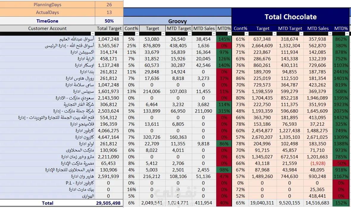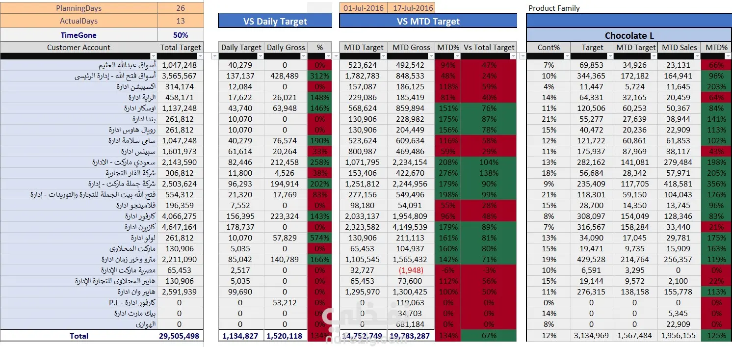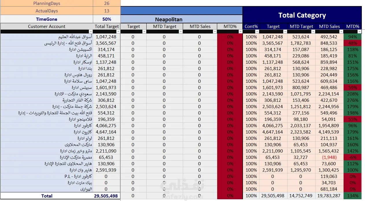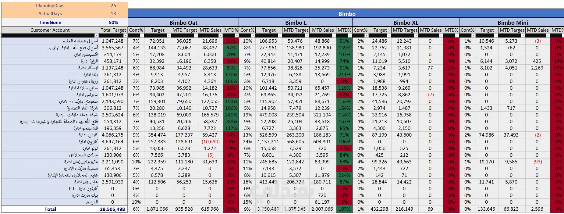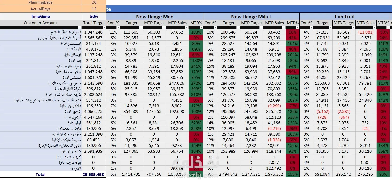 تقرير المبيعات (Sales Report) تم إعداد هذا التقرير باستخدام برنامج Excel بهدف تحليل أداء المبيعات ومتابعة تحقيق الأهداف اليومية والشهرية. يتضمن التقرير مقارنة تفصيلية بين المبيعات الفعلية والأهداف المخططة مع حساب النسب المئوية ونسب الإنجاز لكل فئة من المنتجات. كما يحتوي على تحليل شامل للفئات (Category Analysis) لمعرفة أعلى المنتجات مبيعًا ونسب المساهمة في إجمالي المبيعات. تم الاعتماد على مجموعة من الأدوات داخل Excel مثل Pivot Tables، Conditional Formatting، والدوال الحسابية المتقدمة لعرض البيانات بصورة تفاعلية ومنظمة، بالإضافة إلى مخططات بيانية (Charts) توضح مدى تحقيق الأهداف خلال فترة التقرير. يهدف المشروع إلى مساعدة الإدارة على تقييم الأداء، تحديد نقاط القوة والضعف، واتخاذ قرارات مبنية على البيانات الفعلية لتحسين كفاءة المبيعات المستقبلية.