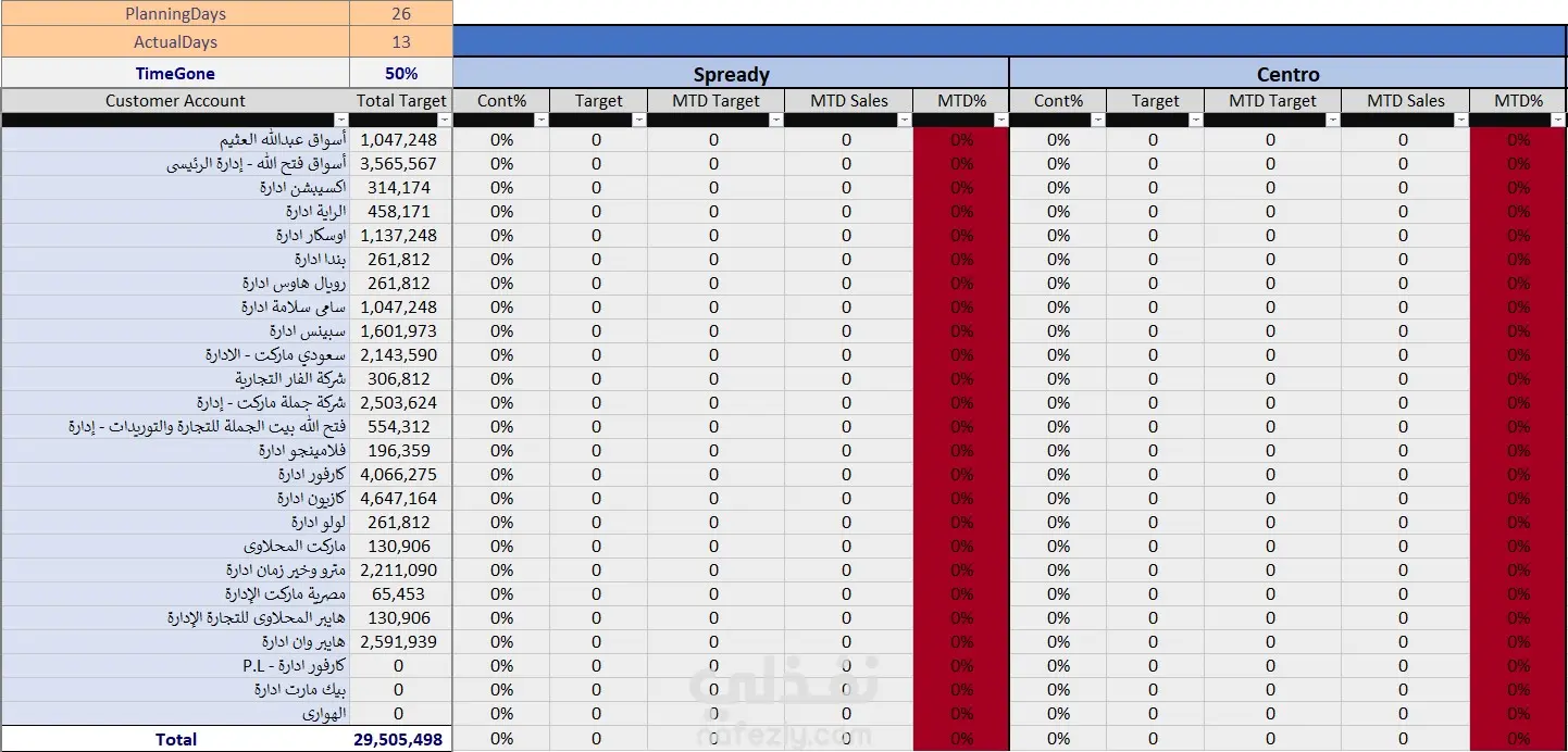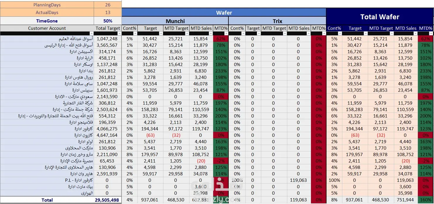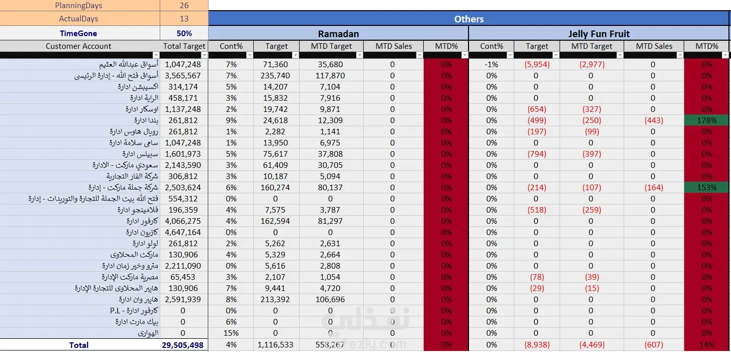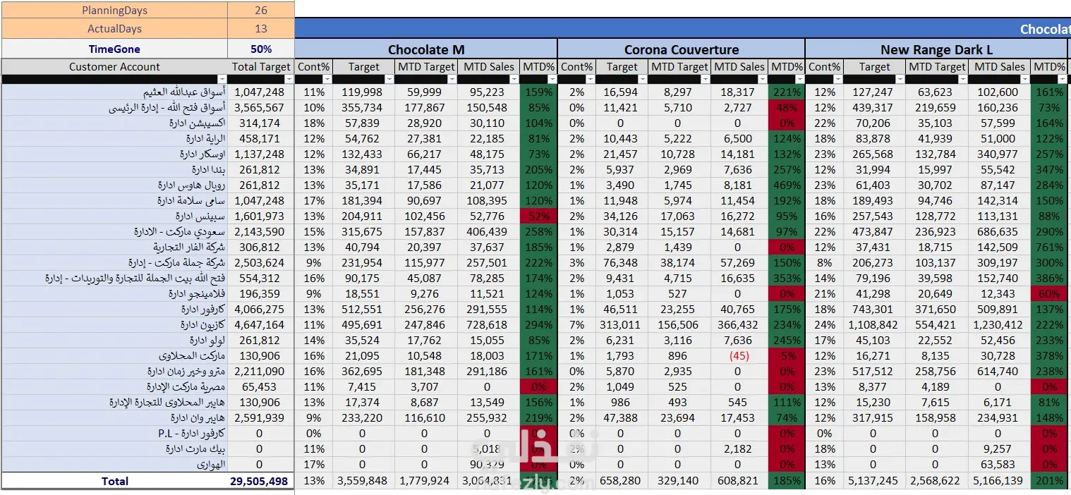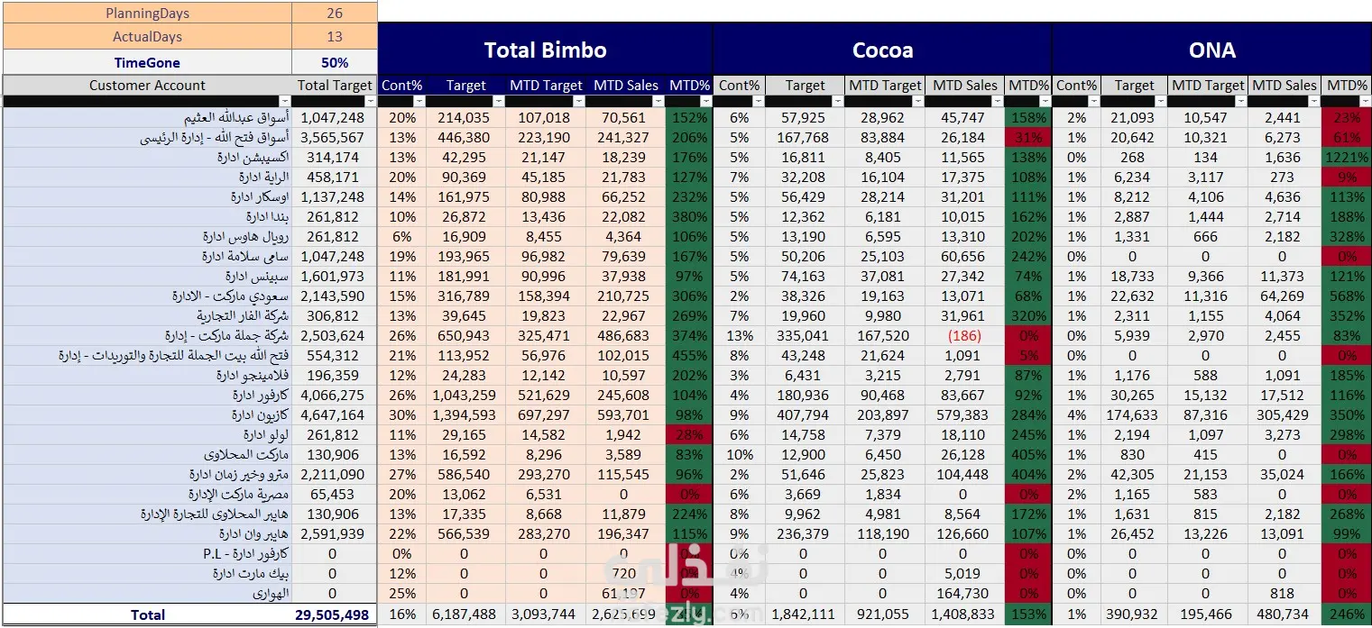 تقرير المبيعات (Sales Report) تم إعداد هذا التقرير باستخدام برنامج Excel بهدف تحليل أداء المبيعات ومتابعة تحقيق الأهداف اليومية والشهرية. يتضمن التقرير مقارنة تفصيلية بين المبيعات الفعلية والأهداف المخططة مع حساب النسب المئوية ونسب الإنجاز لكل فئة من المنتجات. كما يحتوي على تحليل شامل للفئات (Category Analysis) لمعرفة أعلى المنتجات مبيعًا ونسب المساهمة في إجمالي المبيعات. تم الاعتماد على مجموعة من الأدوات داخل Excel مثل Pivot Tables، Conditional Formatting، والدوال الحسابية المتقدمة لعرض البيانات بصورة تفاعلية ومنظمة، بالإضافة إلى مخططات بيانية (Charts) توضح مدى تحقيق الأهداف خلال فترة التقرير. يهدف المشروع إلى مساعدة الإدارة على تقييم الأداء، تحديد نقاط القوة والضعف، واتخاذ قرارات مبنية على البيانات الفعلية لتحسين كفاءة المبيعات المستقبلية.