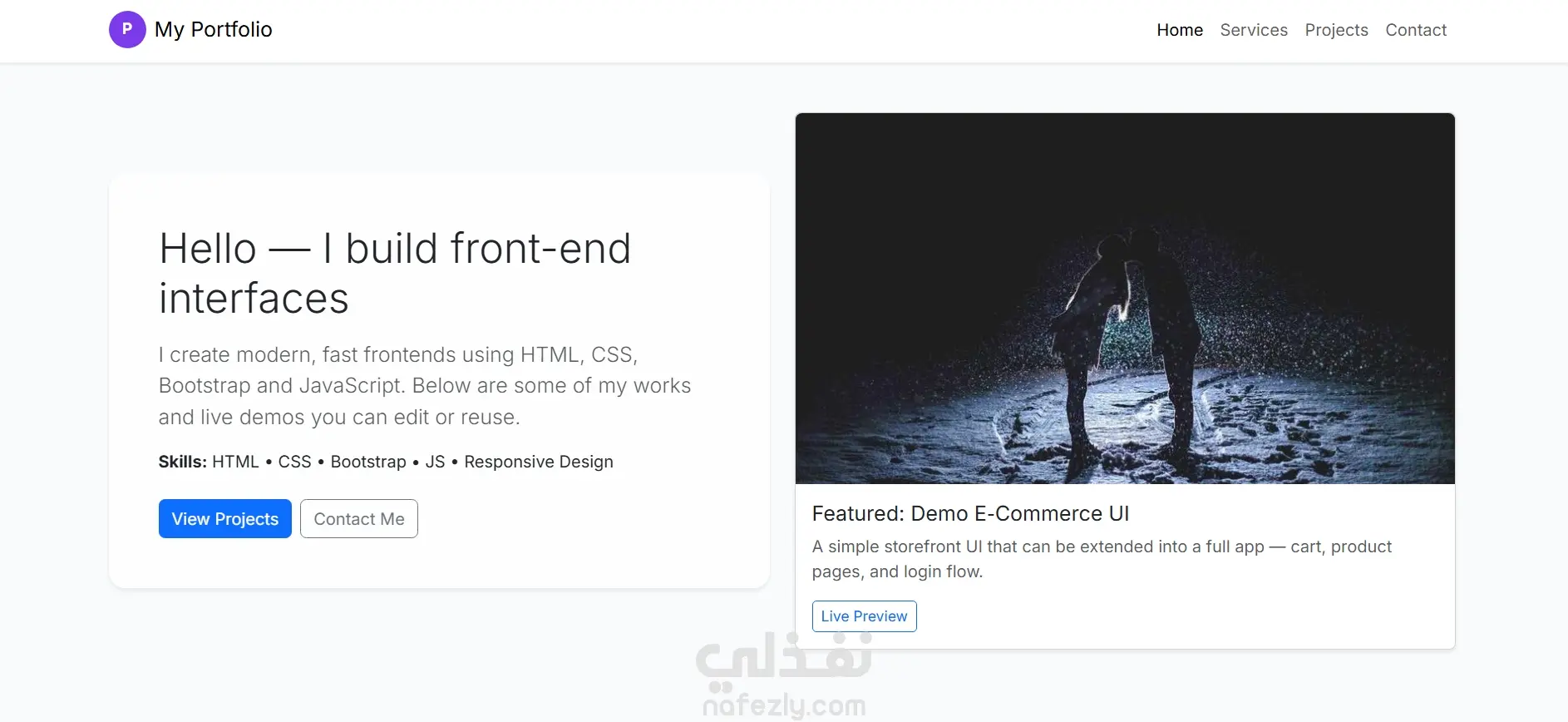 أقسام متكاملة: الرئيسية – الخدمات – المشروعات – التواصل – التذييل (Footer).