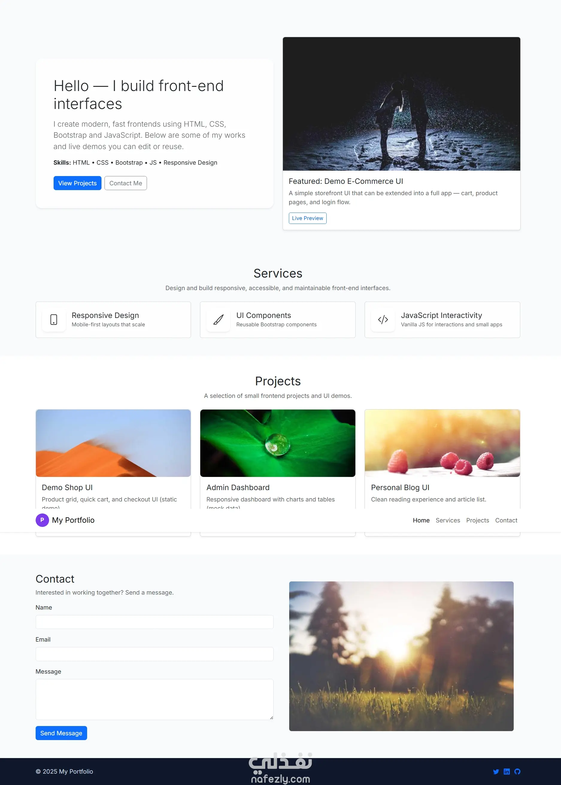 عناصر تفاعلية مثل نموذج التواصل الديناميكي ونافذة المعاينة (Modal Preview).