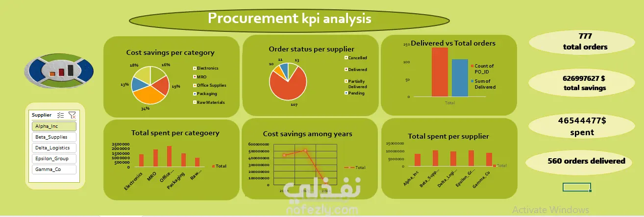 باسنخدام أدوات برنامج excel , و power bi تم تحليل بيانات لأكثر من 500 عملية توريد لتحديد عدد من النقاط مثل: اجمالى عدد الطلبات نسبة اتمام التوريد بين الموردين متوسط عدد أيام التوريد مقدار ما تم توفيره بواسطة مفاوضات أسعار الشراء المورد صاحب النصيب الأكبر من المدفوعات ( شركاء النجاح)
