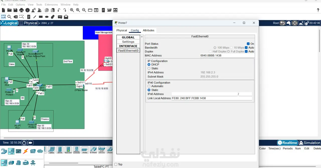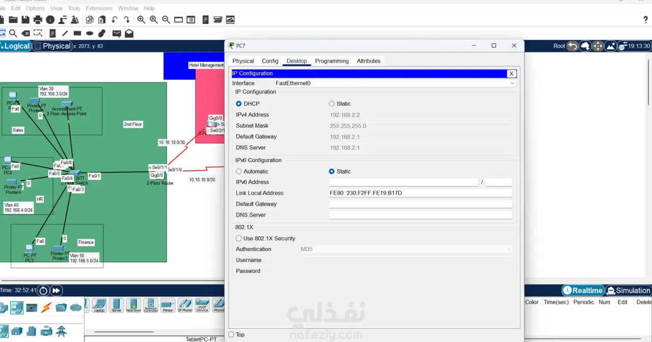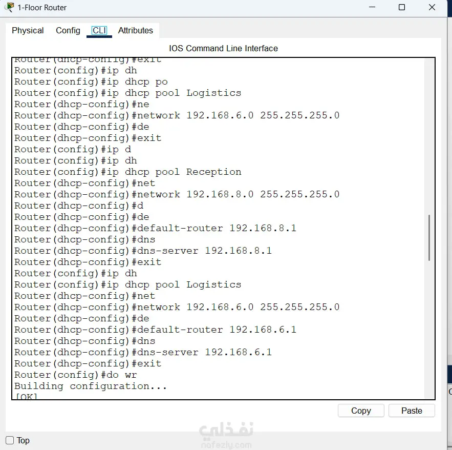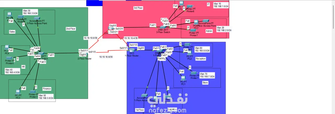 مشروع إدارة شبكة فندقية متكاملة ومقسمة نظرة عامة على المشروع تمثل هذه الدراسة تطبيقًا عمليًا وشاملاً لتصميم وتنفيذ شبكة حاسوبية متكاملة ومُدارة لفندق متعدد الطوابق، بهدف تحقيق أعلى مستويات الكفاءة والأمان وقابلية التوسع. يرتكز المشروع على هندسة شبكية هيكلية تتوزع على ثلاثة أدوار، حيث خُصص لكل دور تجهيزاته الأساسية من مُوجّه (Router) ومُحوّل (Switch) لضمان استقلالية الإدارة المحلية وفعالية الاتصال. العناصر التقنية الرئيسية الموظفة لتحقيق بيئة شبكية مُحكمة ومُنظمة، تم الاعتماد على حزمة من البروتوكولات والتقنيات الأساسية في هندسة الشبكات: الشبكات المحلية الافتراضية (VLANs - Virtual Local Area Networks): لضمان الفصل المنطقي بين أقسام الفندق المختلفة (مثل: الإدارة، الحجوزات، خدمة الغرف، الضيوف)، تم استخدام تقنية الـ VLANs. يساهم هذا الفصل في تحسين الأداء الأمني للشبكة، وتقليل نطاق بث الحزم (Broadcast Domain)، وتسهيل إدارة حركة البيانات الخاصة بكل قسم. بروتوكول التهيئة الديناميكية للمُضيف (DHCP - Dynamic Host Configuration Protocol): لأتمتة عملية توزيع عناوين بروتوكول الإنترنت (IP Addresses) على الأجهزة الطرفية (PCs) داخل كل دور، مما يقلل من الأخطاء التشغيلية ويسهل إضافة أو إزالة الأجهزة بكفاءة وسرعة. نظام أسماء النطاقات (DNS - Domain Name System): لتمكين المستخدمين والأجهزة من الوصول إلى الموارد عبر الأسماء بدلاً من عناوين الـ IP الرقمية، مما يوفر تجربة استخدام سلسة وفعالة داخل بيئة الفندق. بروتوكول التوجيه (OSPF - Open Shortest Path First): لضمان تبادل معلومات التوجيه بين الموجهات (Routers) في الأدوار الثلاثة بكفاءة عالية، مما يسمح للأجهزة في أي دور بالتواصل المباشر والفعّال مع الأجهزة في الأدوار الأخرى، واختيار المسار الأقصر والأكثر موثوقية لإرسال البيانات. النتائج المحققة أفضى التنفيذ الناجح لهذه البنية إلى إنشاء شبكة حاسوبية تعمل بكامل طاقتها، حيث تم التحقق من أن جميع الأجهزة الطرفية (PCs) ضمن الأدوار المختلفة قادرة على التواصل الكامل والمنظم مع بعضها البعض، محققة بذلك الهدف الأساسي للمشروع وهو الإدارة الفعالة لبيانات وعمليات الفندق.