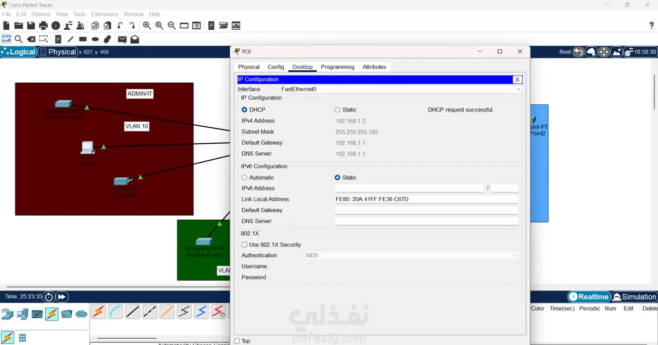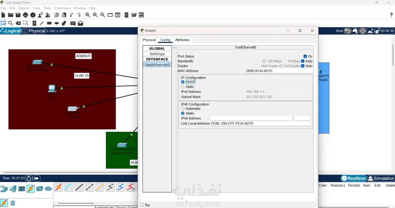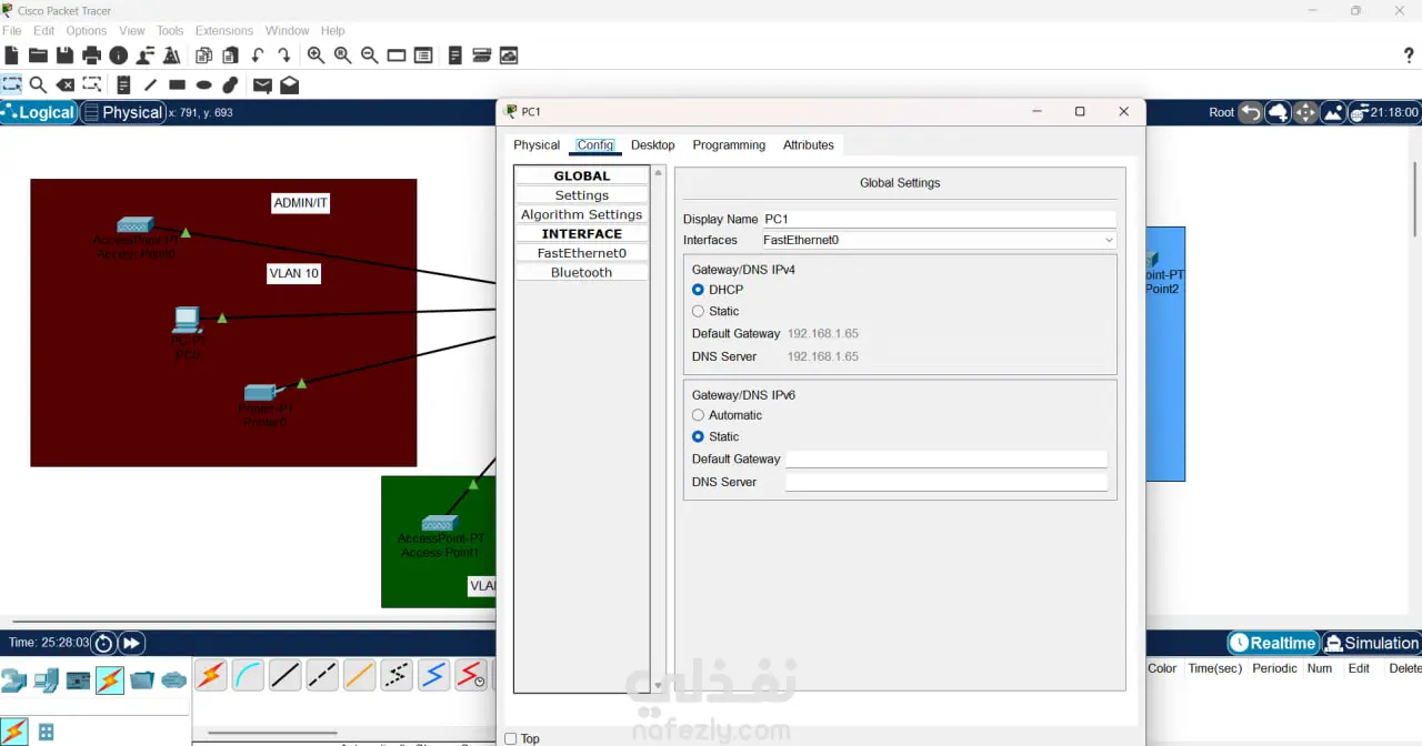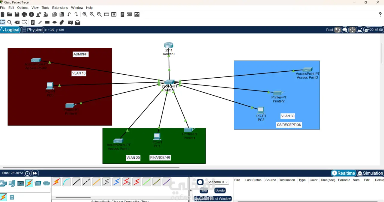 نظرة عامة على المشروع يهدف هذا المشروع إلى تصميم وتنفيذ شبكة حاسوبية فعّالة ومُؤمَّنة على نطاق المكتب الصغير أو المكتـب المنزلي (SOHO). ركّز التصميم على إنشاء بنية تحتية بسيطة لكنها منظمة وقابلة للإدارة، باستخدام مُوجّه (Router) ومُحوّل (Switch) كنقاط محورية للاتصال، لخدمة ثلاثة أقسام إدارية داخل المكتب. العناصر التقنية الرئيسية الموظفة لضمان عمل الشبكة بكفاءة مع الحفاظ على خصوصية البيانات لكل قسم، تم تطبيق التقنيات التالية: الشبكات المحلية الافتراضية (VLANs - Virtual Local Area Networks): تم استخدام الـ VLANs لتقسيم الشبكة المادية الواحدة إلى ثلاث شبكات منطقية منفصلة. هذا التقسيم يضمن عزل حركة المرور بين الأقسام الثلاثة (مثل قسم المبيعات عن قسم المحاسبة)، مما يُعزز من الأداء الأمني للشبكة ويقلل من ازدحام نطاق البث (Broadcast traffic). بروتوكول التهيئة الديناميكية للمُضيف (DHCP - Dynamic Host Configuration Protocol): تم إعداد خادم DHCP على المُوجّه لتوزيع عناوين بروتوكول الإنترنت (IP Addresses) بشكل تلقائي وديناميكي على الأجهزة داخل كل VLAN. أُنشئت ثلاثة نطاقات (Scopes) منفصلة لـ DHCP، بحيث يخدم كل نطاق شبكة VLAN محددة، مما يضمن التوزيع المُنظَّم للعناوين ومنع تداخلها. النتائج المحققة نجح المشروع في إنشاء شبكة مكتبية مُنظمة وآمنة. أصبحت الأجهزة داخل كل قسم معزولة منطقياً عن الأقسام الأخرى، مع الحفاظ على إمكانية الوصول إلى الموارد المشتركة حسب الحاجة، مما يوفر بيئة عمل مُدارة وذات خصوصية عالية بتكلفة تجهيزات منخفضة تناسب بيئة الـ SOHO.