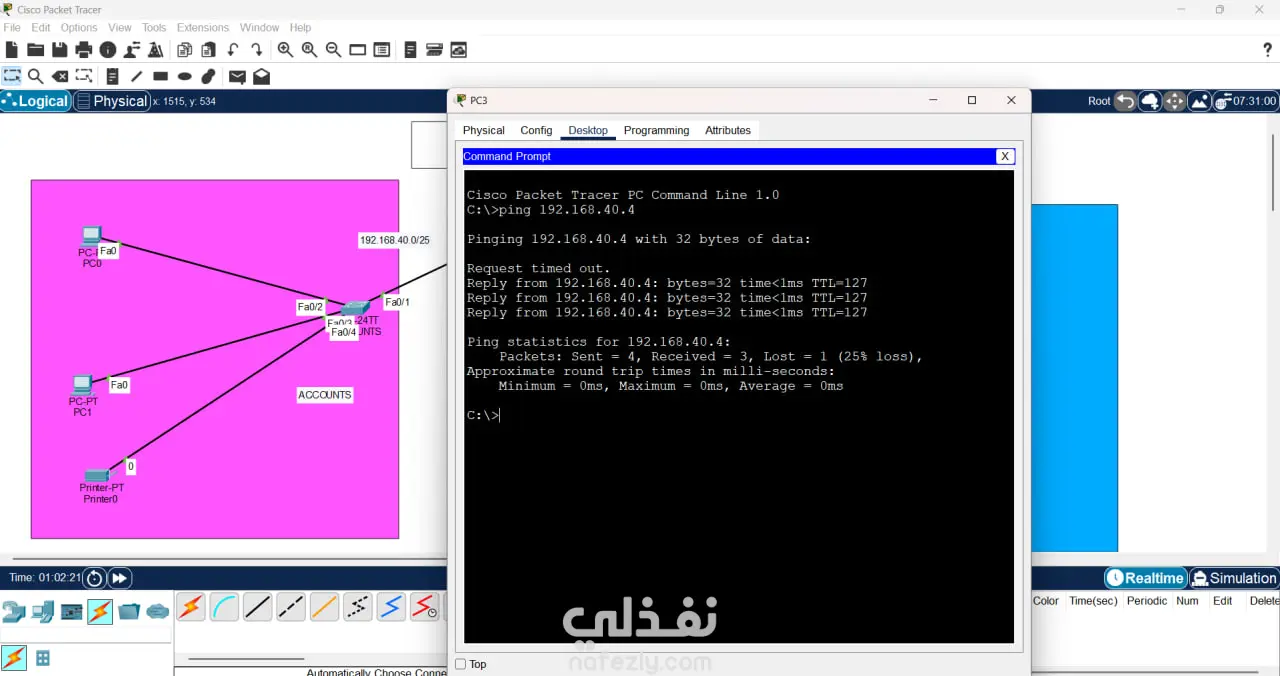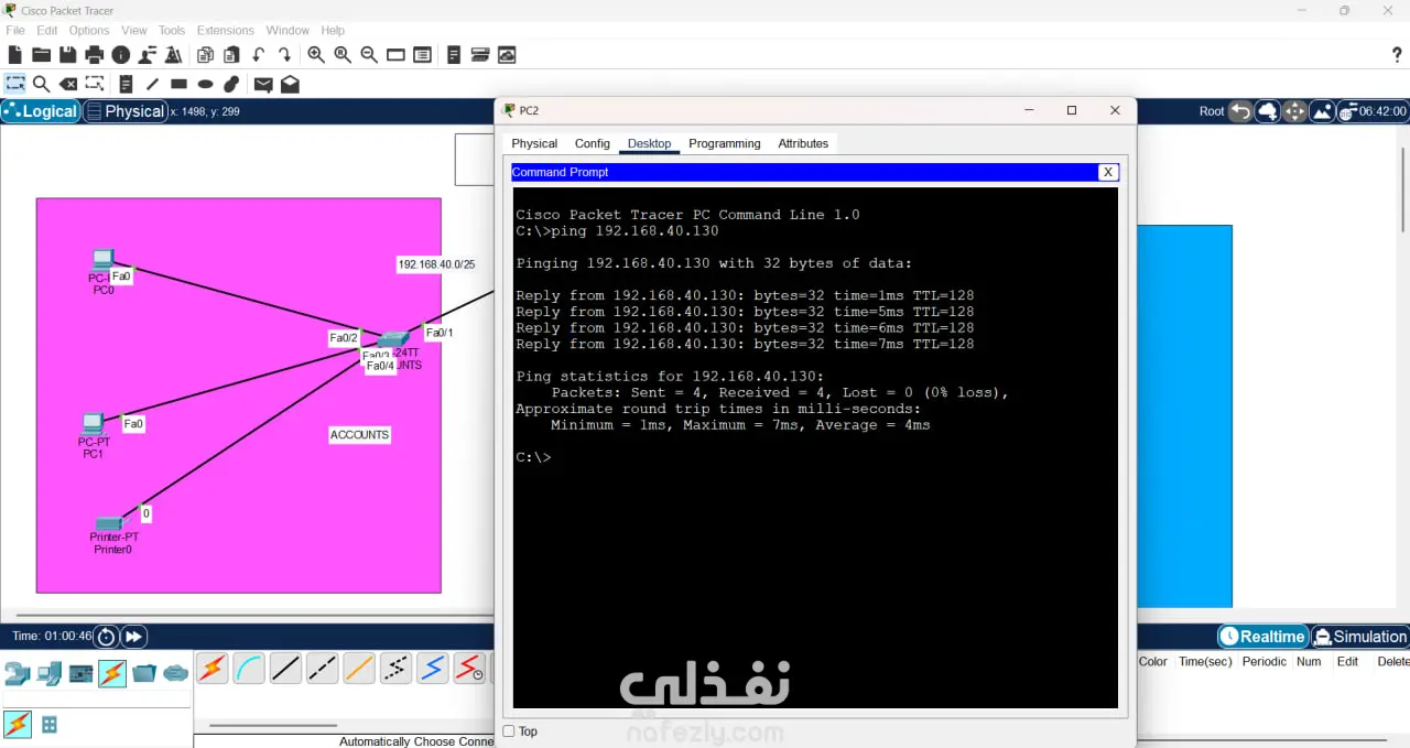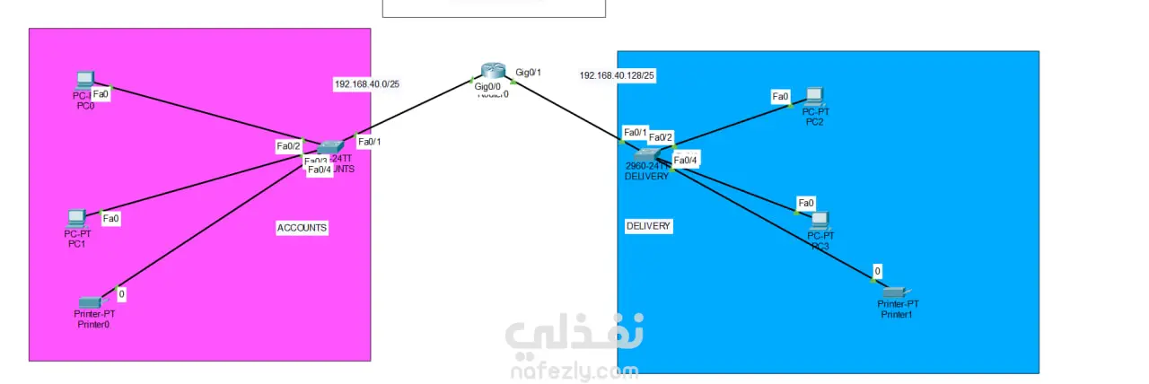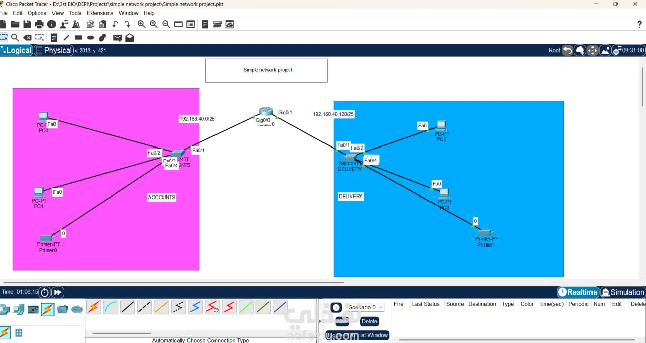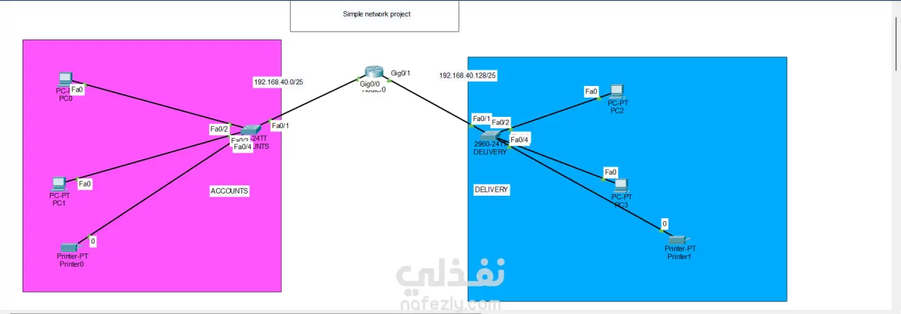 مشروع ربط الأقسام الأساسي باستخدام عناوين IP الثابتة نظرة عامة على المشروع يهدف هذا المشروع إلى إنشاء شبكة حاسوبية بسيطة وفعّالة لربط قسمين رئيسيين هما: قسم التوصيل (Logistics) وقسم الحسابات (Accounting). يعتمد التصميم على هيكلية شبكية تقليدية تستخدم مُوجّه (Router) كنقطة وصل رئيسية بين الشبكتين المحليتين لكل قسم، مع تخصيص مُحوّل (Switch) ومجموعة من الحواسيب الشخصية (PCs) لكل قسم. العناصر التقنية الرئيسية الموظفة لضمان الاتصال المباشر والموثوق بين القسمين، تم الاعتماد على عنصر فني رئيسي: عناوين بروتوكول الإنترنت الثابتة (Static IP Addressing): تم تعيين عناوين بروتوكول الإنترنت (IP Addresses) لجميع الأجهزة الطرفية (PCs) والبوابات الافتراضية (Gateways) بشكل يدوي وثابت. يضمن هذا النهج التحكم الكامل في تخصيص العناوين، ويوفر بيئة ثابتة وموثوقة مثالية للشبكات الصغيرة التي تتطلب سهولة في المراقبة والتشخيص. التوجيه البيني (Inter-VLAN/Subnet Routing): تم استخدام المُوجّه (Router) لربط الشبكتين المنفصلتين (شبكة التوصيل وشبكة الحسابات)، مما يتيح للأجهزة في أي قسم التواصل بنجاح ومباشرة مع الأجهزة الموجودة في القسم الآخر، بناءً على جداول التوجيه المُعدة على المُوجّه. النتائج المحققة أُنجز المشروع بنجاح، مما أسفر عن شبكة وظيفية بالكامل. أصبحت الأجهزة في قسم التوصيل قادرة على التواصل مع الأجهزة في قسم الحسابات، مما يسهل سير العمل المشترك وتبادل البيانات الأساسية بين الإدارتين، مع تحقيق أقل قدر من التعقيد في الإدارة والتهيئة.