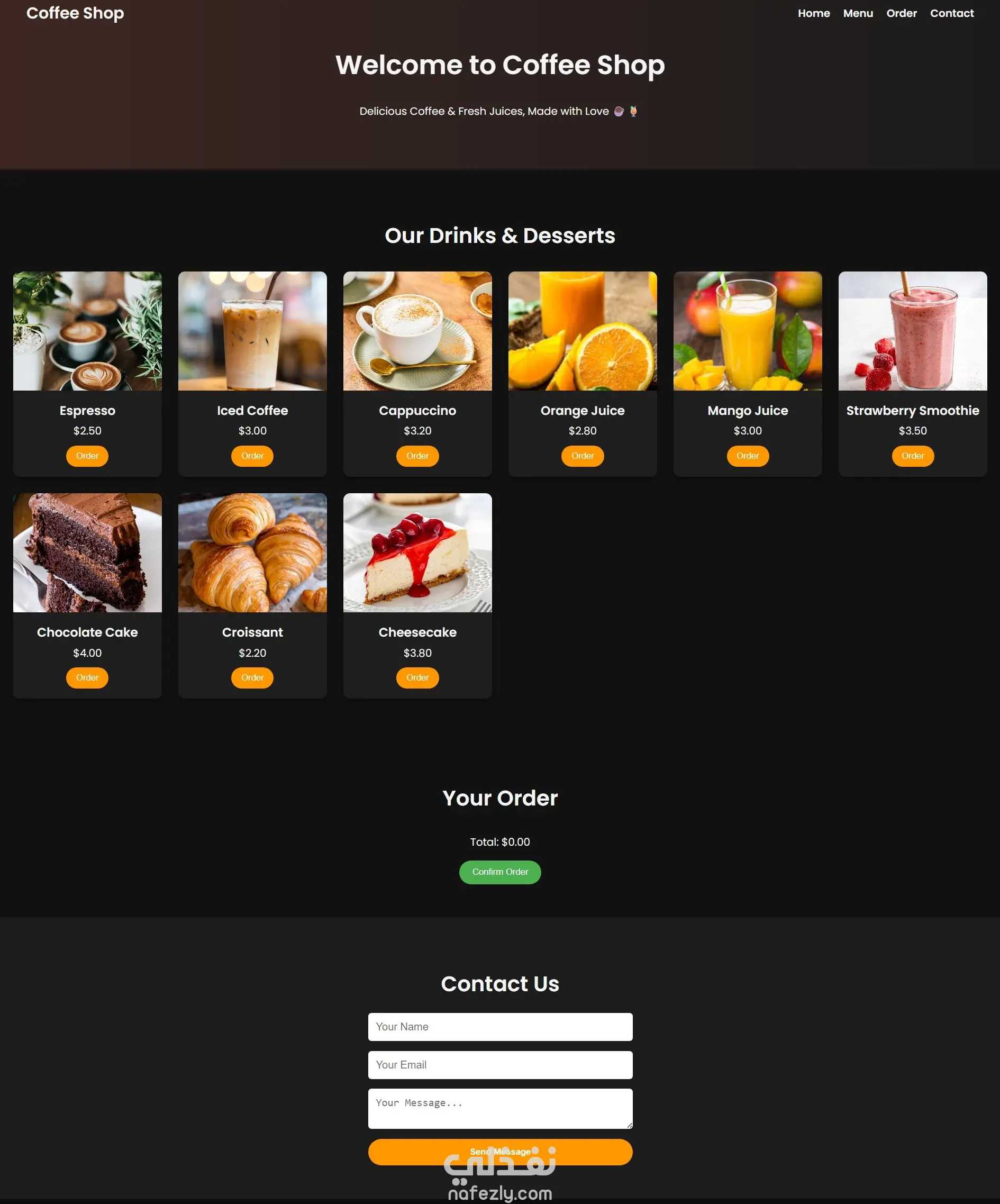 This project is a static coffee shop website design developed using only HTML and CSS, without any backend programming or JavaScript. The website includes: A simple interactive order section, where when you select a drink and click the "Order" button, the total price of the selected drinks is calculated and displayed right below the section. A contact form included purely for visual purposes. It is designed to look neat and attractive but is not connected to any backend system and cannot actually send messages. The goal of this design is to focus on: A clean and appealing user interface (UI) that reflects the coffee shop theme. A simple user experience with basic visual interactivity that gives a lively feel without complex programming. Using only HTML and CSS to provide a design sample that can be showcased as a portfolio piece or a prototype for a full website.
