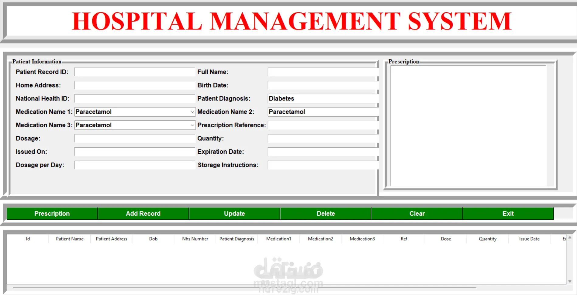 نظام إدارة مستشفى مصغر يهدف لتسهيل متابعة بيانات المرضى والأدوية داخل عيادة أو مستشفى صغير. المزايا الأساسية: واجهة رسومية بسيطة ومفصلة تعرض حقول: رقم السجل، الاسم، العنوان، تاريخ الميلاد، رقم التأمين/الهوية، التشخيص، أسماء الأدوية، الجرعات، تاريخ الإصدار والانتهاء، تعليمات التخزين، ومنطقة لوصفة طبية قابلة للطباعة أو العرض. عمليات CRUD كاملة: إضافة سجل، تحديث سجل، حذف سجل، وتفريغ الحقول. جدول عرض (Grid) لعرض السجلات المخزنة من قاعدة بيانات SQLite مع إمكانية التمرير والاختيار. تخزين محلي باستخدام SQLite — مناسب للتطبيقات الفردية ولا يتطلب خادم خارجي. بنية بسيطة وسهلة التعديل: من السهل إضافة ميزات لاحقة مثل البحث المتقدم، التصدير إلى CSV/PDF، أو الربط بقاعدة بيانات مركزية. مناسب للاستخدام في عيادات صغيرة، مشاريع تعليمية، أو كنموذج أولي لأنظمة إدارة السجلات الطبية.
