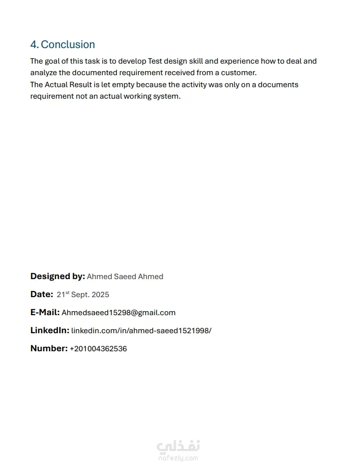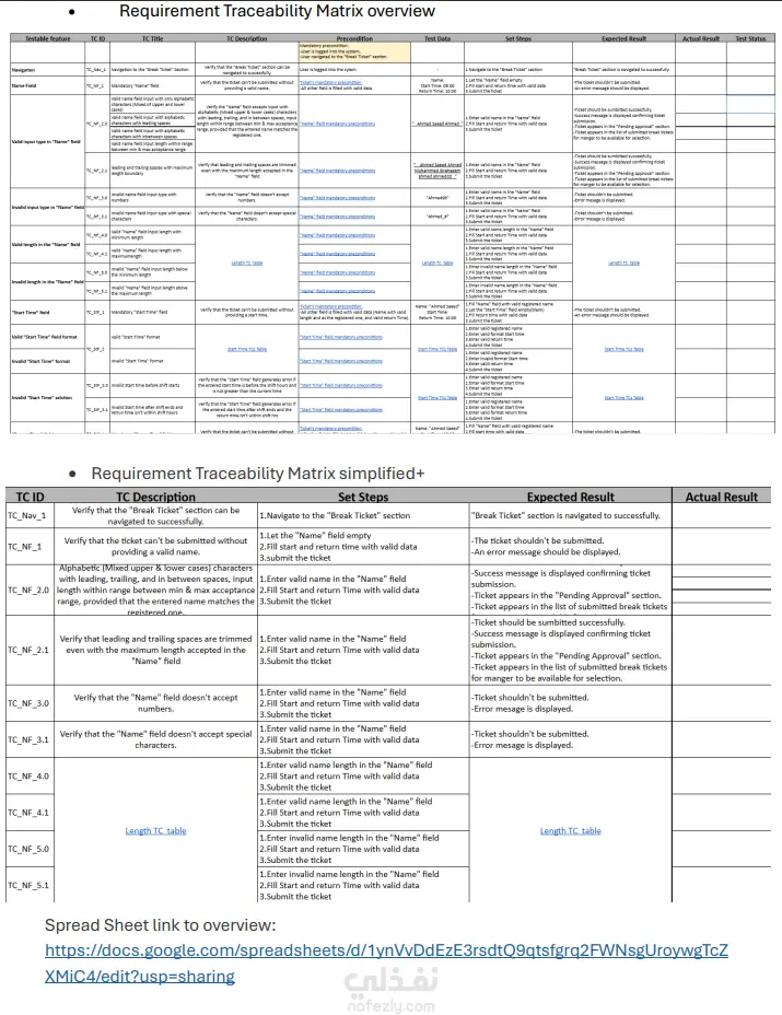 باستخدام هذه المتطلبات، تم تطوير مصفوفة تتبع المتطلبات (Requirement Traceability Matrix) وحالات الاختبار (Test Cases)، مثل اختبارات التحقق من الإلزامية (TC_NF_1)، واختبارات فئات التكافؤ والحدود لضمان الرفض الصحيح للأرقام والأحرف الخاصة في حقل الاسم (TC_NF_3.0, TC_NF_3.1). هذا العمل يهدف إلى تطوير مهارة تصميم الاختبار وتحليل المتطلبات الموثقة.