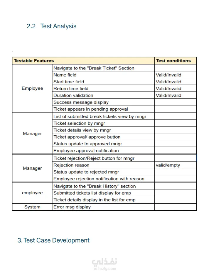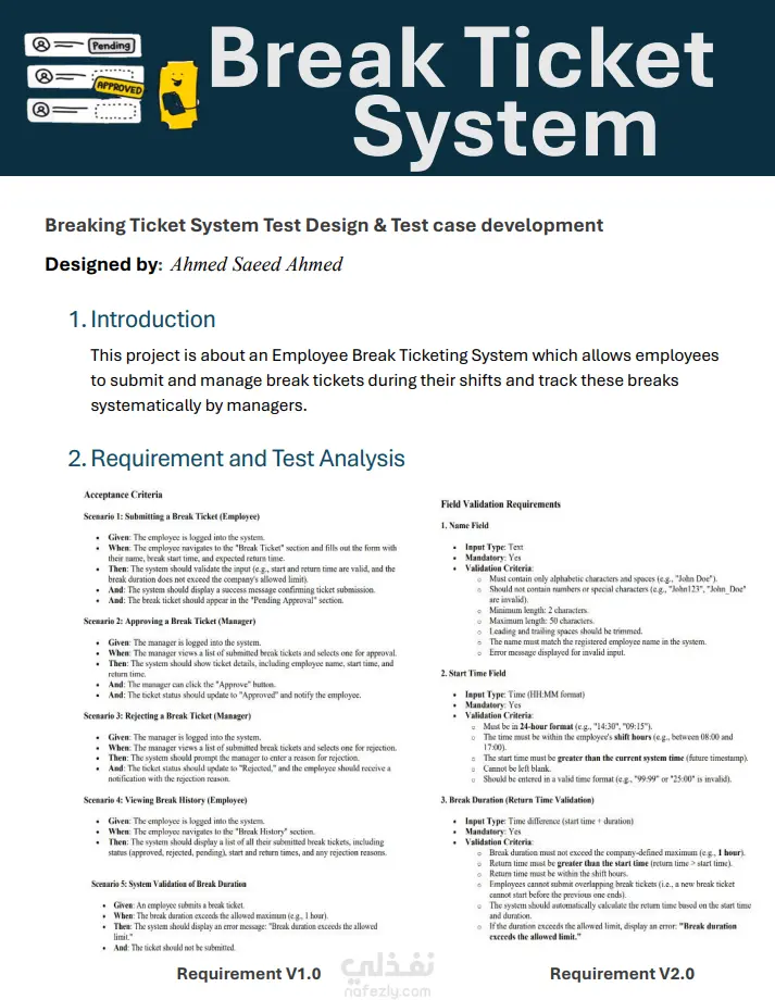تمحور هذا المشروع حول تطبيق منهجية هندسة الجودة (QA) لتصميم واختبار "نظام تذاكر إجازات الموظفين" (Employee Break Ticketing System). الهدف كان ضمان أن النظام يلبي جميع متطلبات العمل الموثقة، وذلك بالتركيز على ثلاثة محاور رئيسية: تحليل المتطلبات، وتصميم الاختبارات، وتطوير حالات الاختبار.