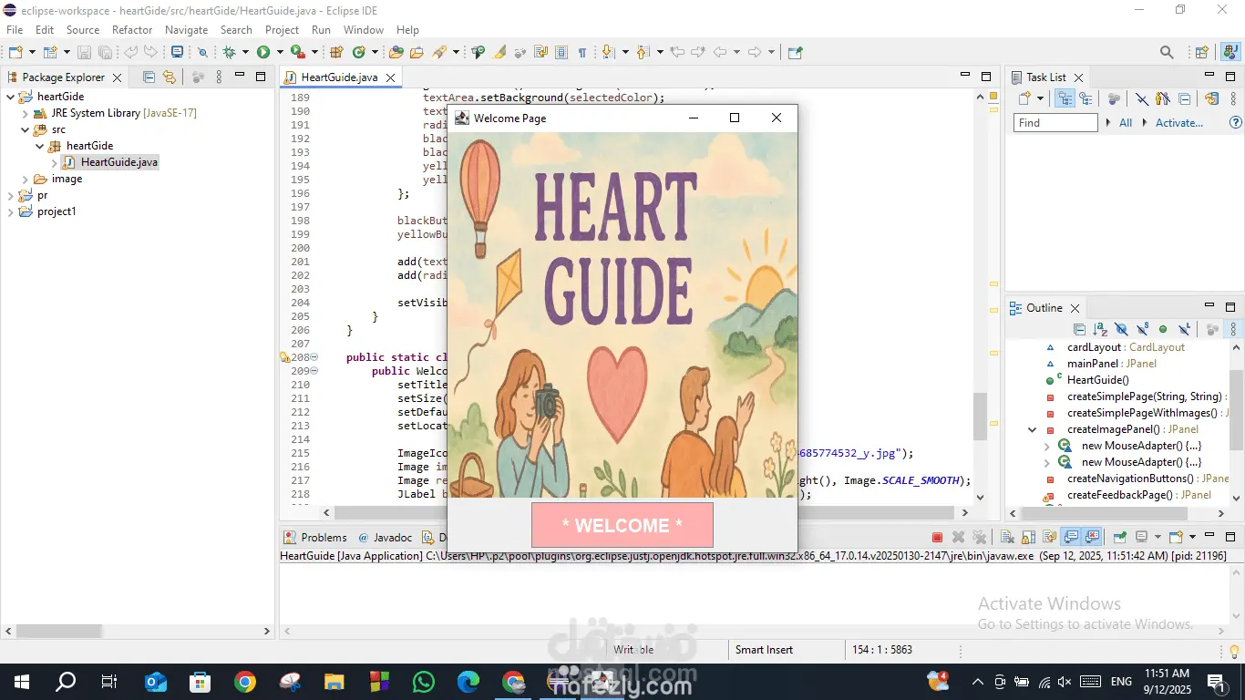 HeartGuide هو تطبيق تفاعلي متكامل تم تطويره باستخدام Java وواجهة Swing لتقديم تجربة سهلة ومرنة لإدارة ومتابعة ذكريات وعلاقات الأصدقاء والعائلة. يتيح التطبيق للمستخدمين الوصول إلى صفحات متعددة تشمل الصفحة الرئيسية، قسم الأصدقاء، قسم العائلة، وصفحة التعليقات. مميزات التطبيق: واجهة مستخدم رسومية تفاعلية وسهلة الاستخدام. صفحة رئيسية تعرض الصور والروابط لأقسام الأصدقاء والعائلة. قسم الأصدقاء يتيح عرض الأنشطة أو الملاحظات المتعلقة بالأصدقاء، مع إمكانية إضافة تفاعلات بسيطة. قسم العائلة يتيح تخصيص الألوان والخلفيات لتجربة تفاعلية ممتعة، مع عرض النصوص والمعلومات المرتبطة بالعائلة. صفحة التعليقات تسمح للمستخدمين بإرسال الملاحظات والتعليقات، مع تأكيد إرسالها عبر رسالة منبثقة. أزرار تنقل سريعة بين الأقسام المختلفة داخل التطبيق. دعم الصور داخل التطبيق وعرضها بطريقة مناسبة داخل واجهة المستخدم. قابلية التوسع لإضافة صفحات أو ميزات جديدة مستقبلًا.