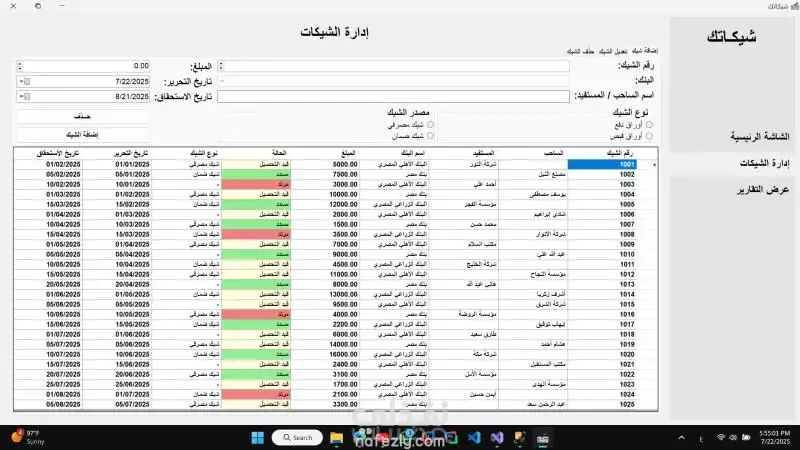 - صفحة لعرض ملخص الشيكات برسوم بيانية حسب الحالة والبنك مع إجمالي الأوراق المسددة وقيد التحصيل. - صفحة لإضافة شيك جديد وتعديل حالة الشيك الغير مسدد وحذف الشيك الغير مسدد. - صفحة للتصفية والبحث المتقدم. هذا التطبيق برمجته بالكامل باستخدام لغة C# وتقنية Windows Forms، وقاعدة بيانات SQL Server LocalDB.