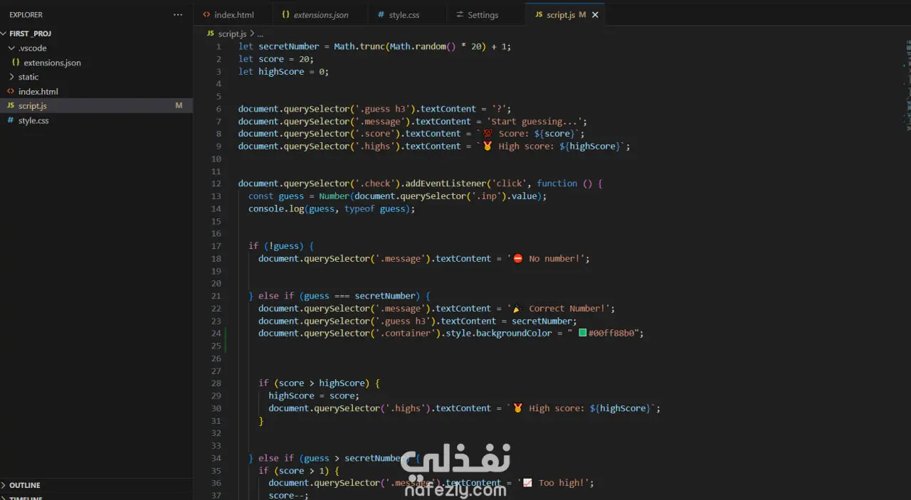 لعبة تخمين الأرقام هي لعبة بسيطة وممتعة تتيح للمستخدم محاولة تخمين رقم عشوائي يتم اختياره بواسطة الكمبيوتر. يقوم اللاعب بإدخال رقم، ويقوم البرنامج بإخباره إذا كان الرقم الذي أدخله أكبر أو أصغر من الرقم الصحيح حتى يتمكن من الوصول إلى الجواب الصحيح. التقنيات المستخدمة: تم تطوير اللعبة باستخدام HTML لبناء الهيكل الأساسي للصفحة، وCSS لتنسيق وتصميم واجهة اللعبة وجعلها جذابة، وJavaScript لتنفيذ منطق اللعبة والتحقق من الأرقام وتفاعل المستخدم مع الصفحة.