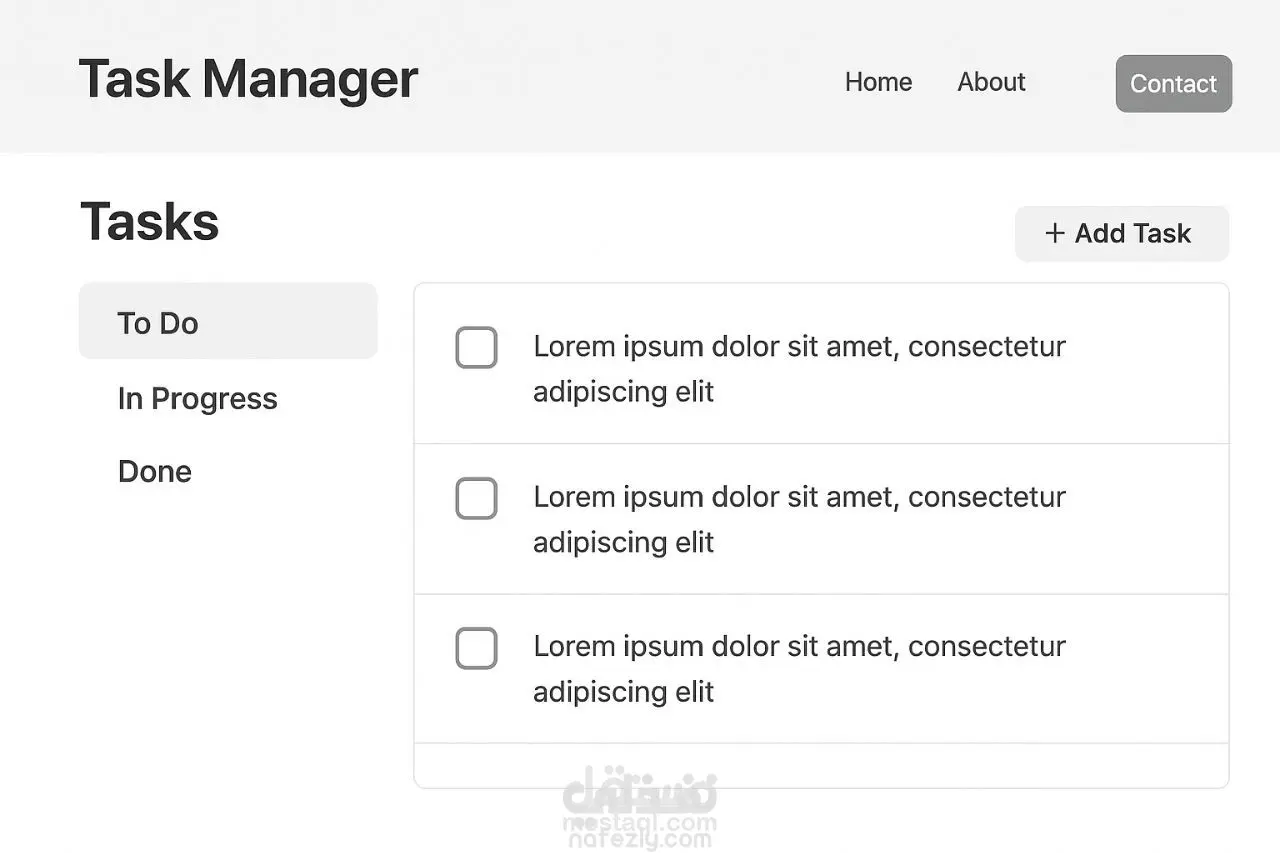 مستخدم يسجل دخول. يضيف/يعدل/يحذف مهام. فلترة حسب الحالة (Pending / In Progress / Done). Dashboard صغير فيه نسبة إنجاز المهام.