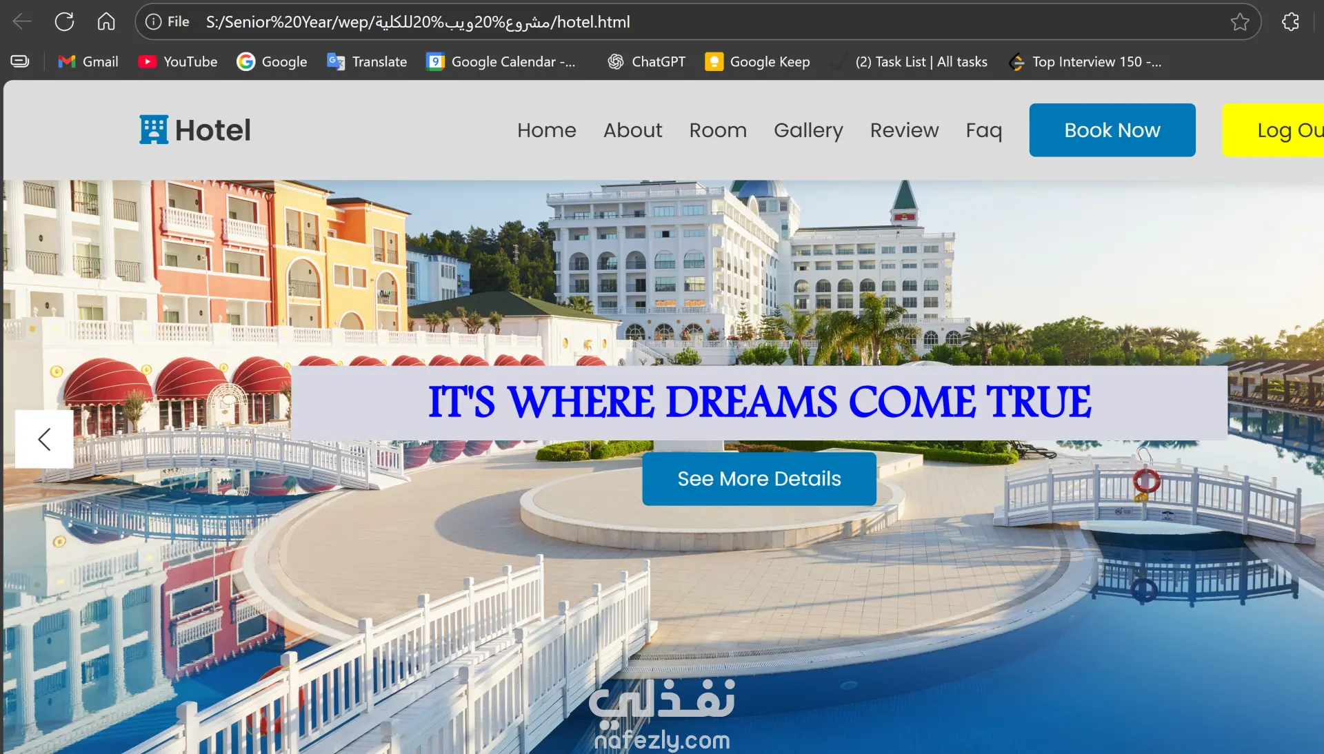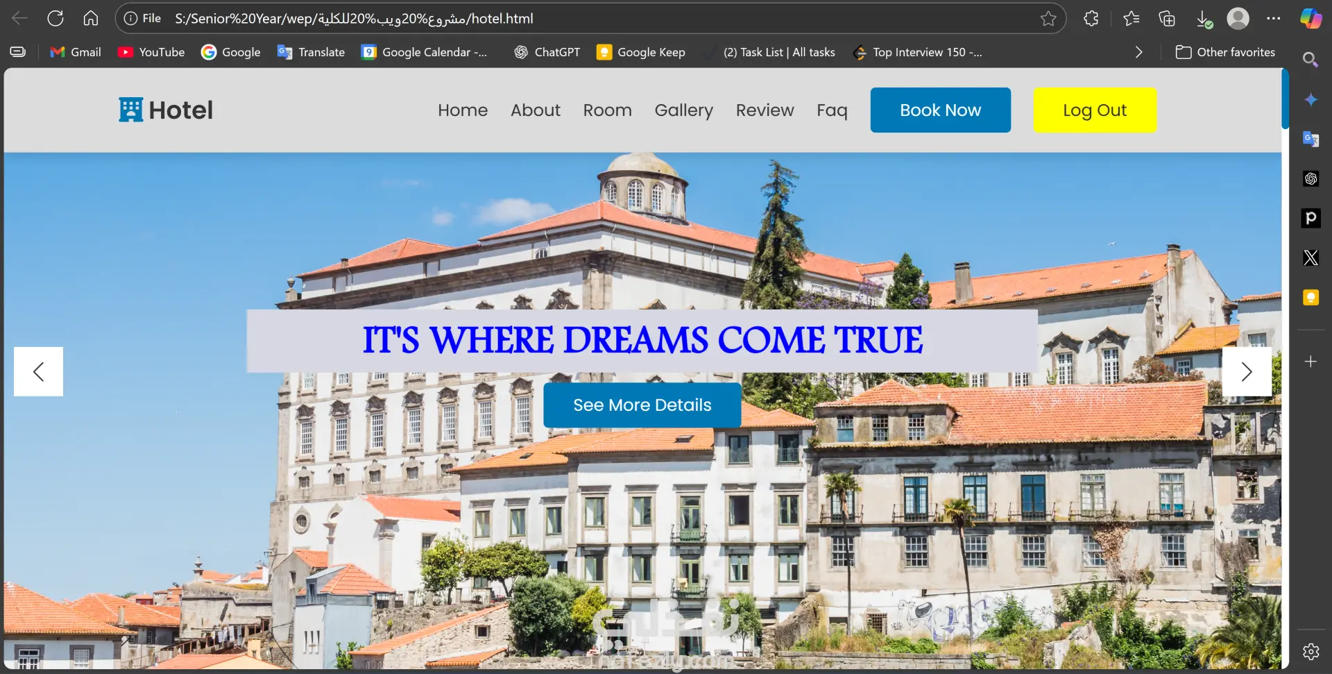 عملت موقع متكامل لحجز الفنادق باستخدام HTML, CSS, JavaScript.