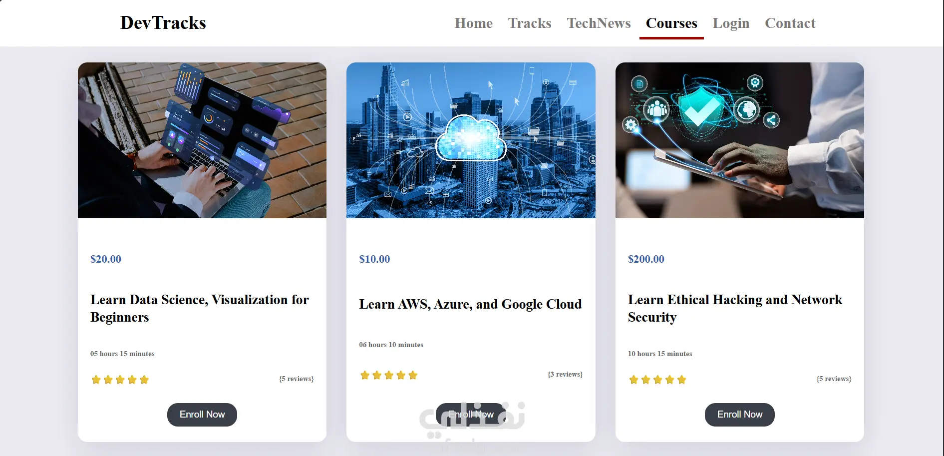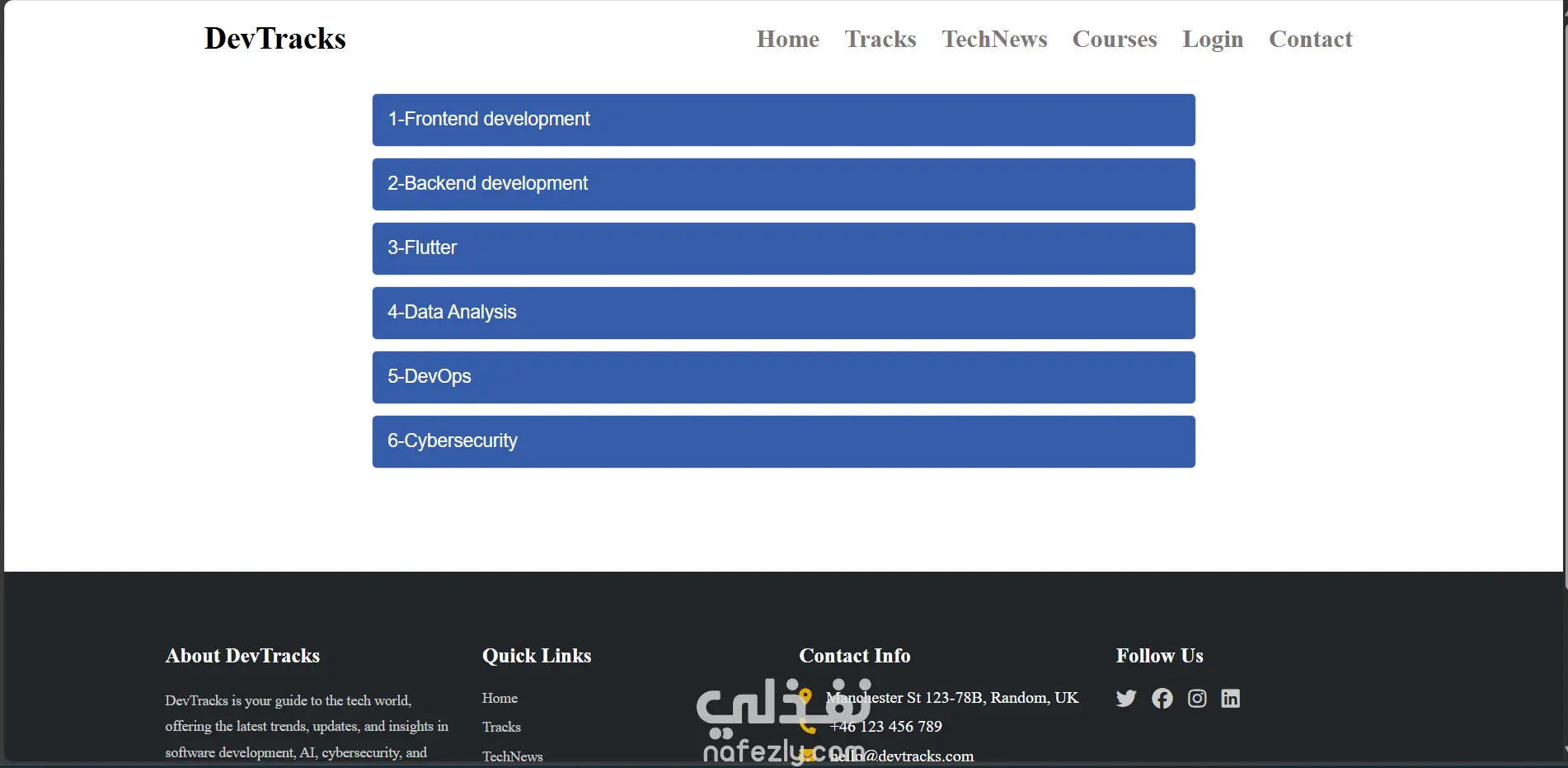 تتكون المنصة من خمس صفحات رئيسية: الصفحة الرئيسية، المسارات التعليمية، الأخبار التقنية، الدورات التدريبية، وصفحة التواصل.