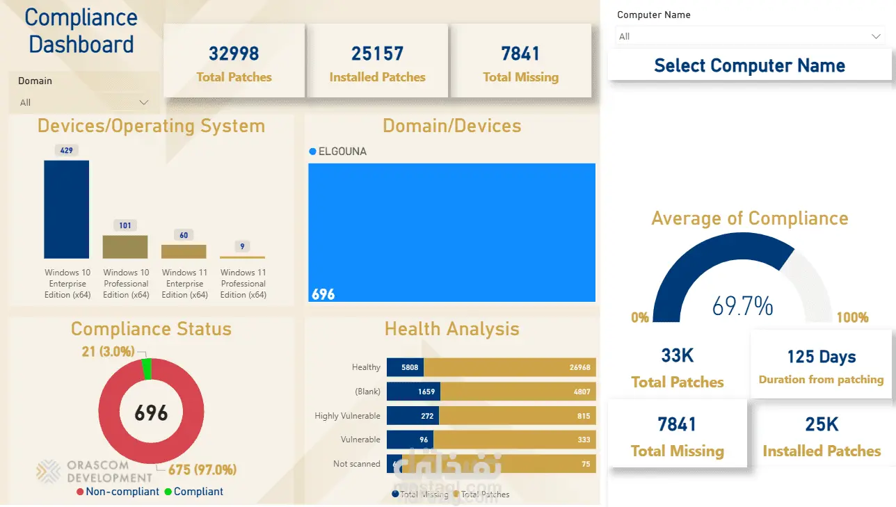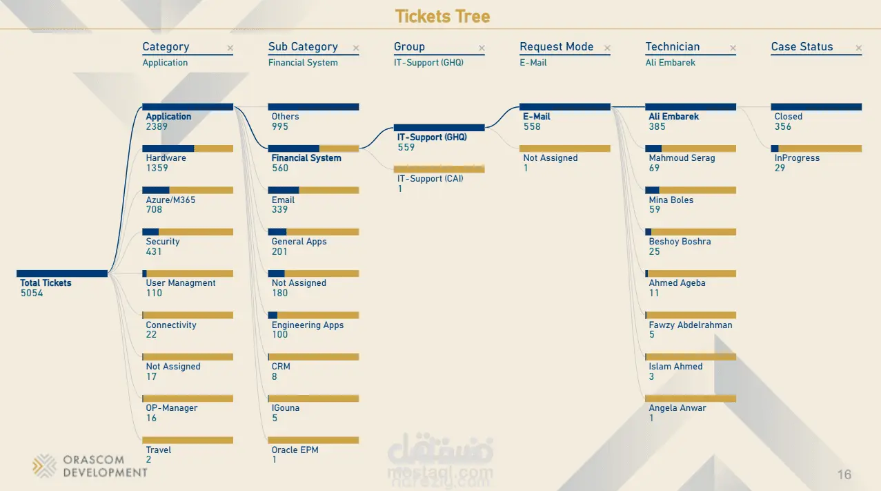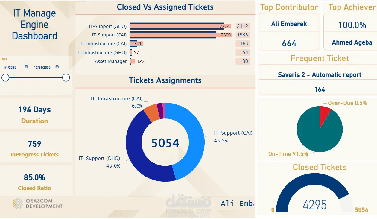 Spearheaded a business intelligence project to integrate data from IT Manage Engine Modules (including ServiceDesk Plus and AssetExplorer) into Power BI. Designed and deployed a suite of real-time, interactive dashboards to provide a holistic view of IT operations and asset performance. Key Achievements: Optimized Service Delivery: Developed a Ticket Management dashboard that analyzed closed vs. assigned tickets, technician performance, and average handling time, resulting in a 91.5% on-time closure rate. Improved IT Compliance: Created a Compliance Dashboard that tracked over 32,000 patches and analyzed compliance status by device and operating system, achieving an average compliance rate of 69.7% and reducing missing patches. Enhanced Operational Efficiency: Built a comprehensive Assets Dashboard to monitor asset categories, states (In Use, In Store), and availability, providing real-time data on over 2,700 total assets for proactive management. Drove Strategic Decisions: Utilized Key Influencers analysis to identify factors (e.g., assigned time, ticket category) that significantly impacted overdue tickets, informing targeted strategies to improve service levels and reduce delays.