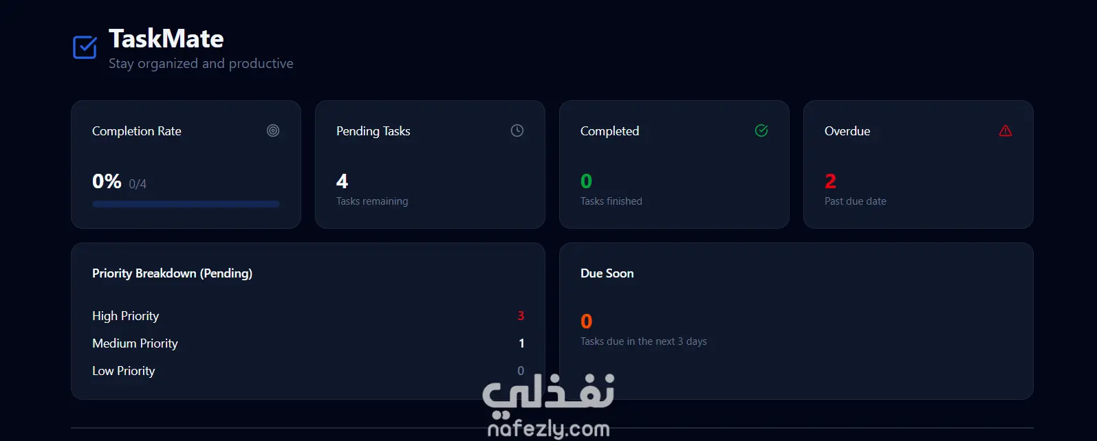 Task Mate is a modern task management web application designed to help users stay organized and productive. The system allows users to add, edit, and delete tasks, mark them as completed, and view progress through a clean dashboard. With its simple and responsive interface, Task Mate makes daily task management effortless and efficient.
