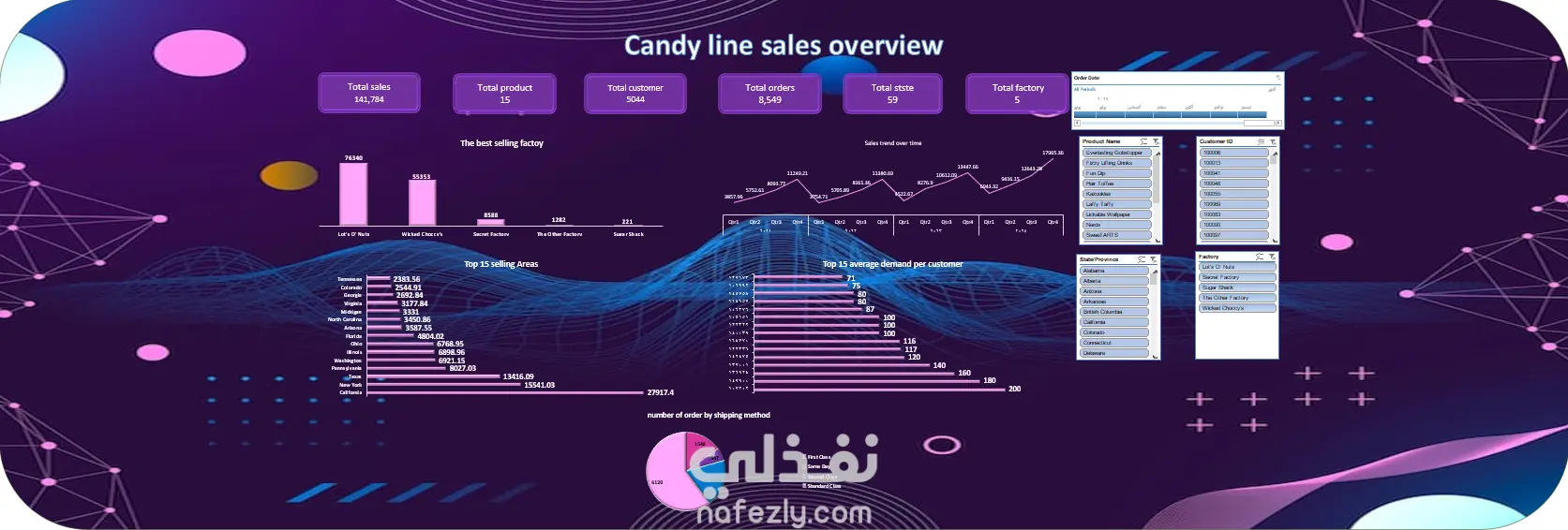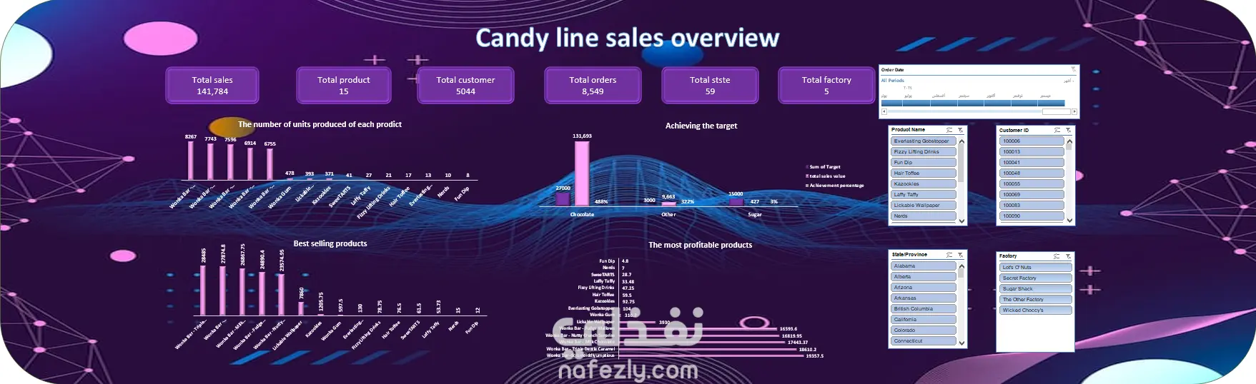 نظرة عامة على مبيعات خط إنتاج الحلويات تم تصميم هذه اللوحة التفاعلية باستخدام: * Power Query * Power Pivot * Pivot Table تقدّم هذه اللوحة نظرة شاملة على خط إنتاج الحلويات، مع تسليط الضوء على أهم مؤشرات الأداء الرئيسية (KPIs): * إجمالي المبيعات: 141,784 * إجمالي عدد المنتجات: 15 * إجمالي عدد الطلبات: 8,549 كما توضح اللوحة ما يلي: * اتجاه المبيعات خلال فترة تشغيل الشركة. * أكثر المنتجات تحقيقًا للمبيعات. * المصانع الأعلى أداءً.
