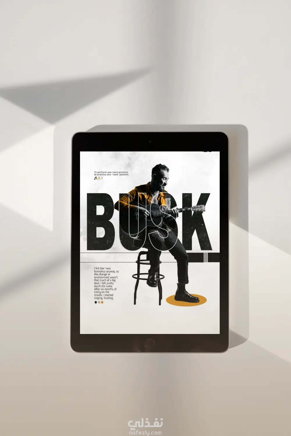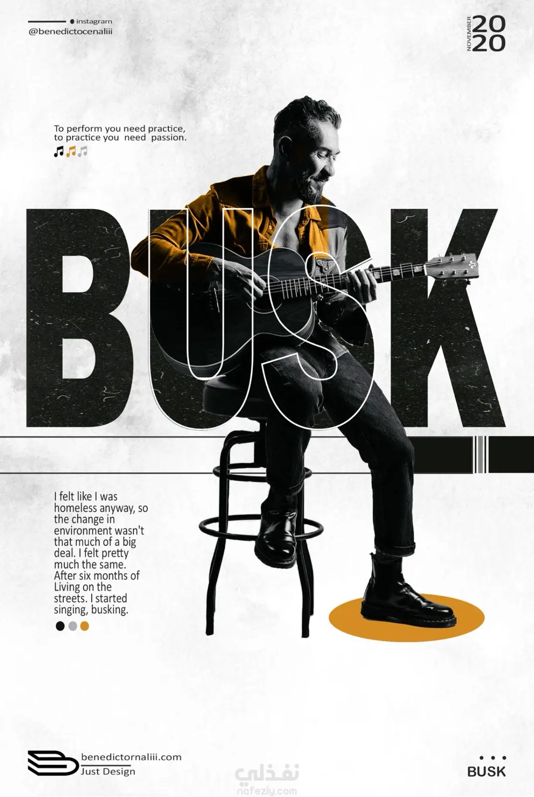 قمت بتصميم بوستر موسيقي بعنوان BUSK باستخدام برنامج Adobe Photoshop، ركزت فيه على الدمج بين الصورة الواقعية والتصميم الطباعي لإبراز هوية البوستر بأسلوب فني وجذاب. استخدمت ألوانًا محدودة وتباينًا قويًا بين العناصر لخلق توازن بصري واضح يجذب الانتباه إلى العازف والعنوان في الوقت نفسه. الهدف من التصميم كان نقل إحساس الشغف بالموسيقى بطريقة بسيطة وأنيقة.