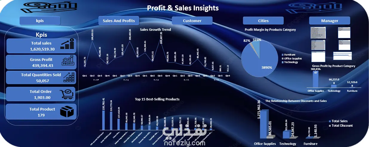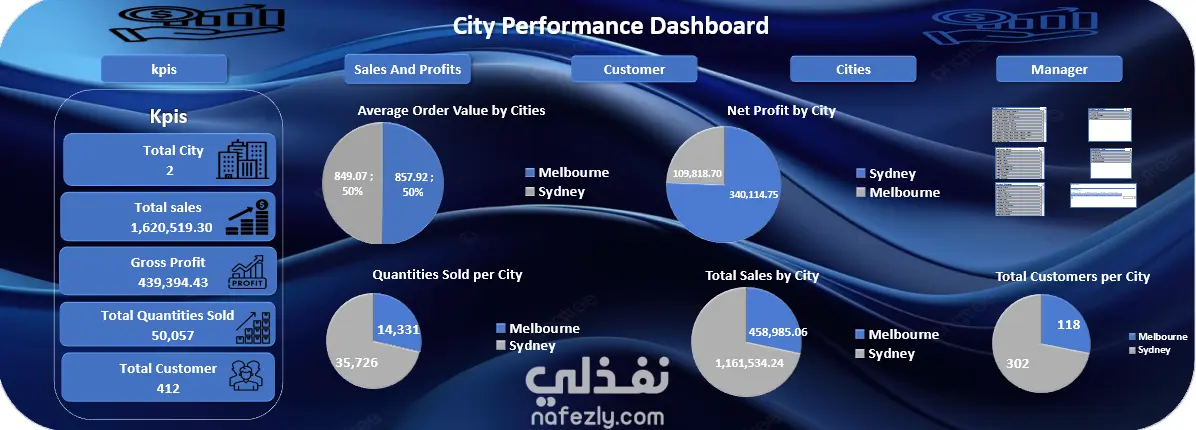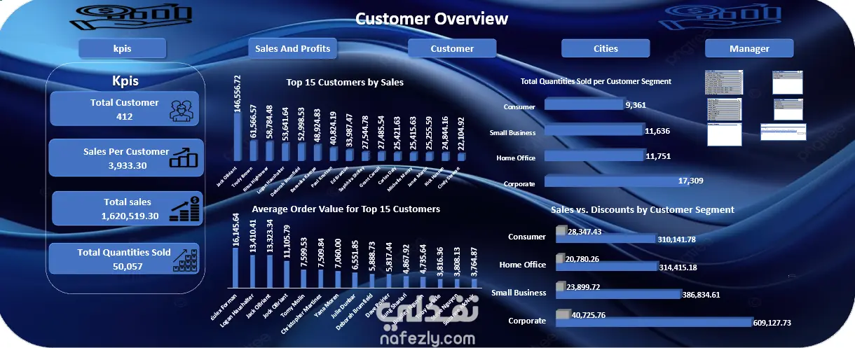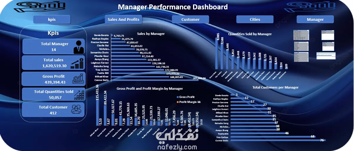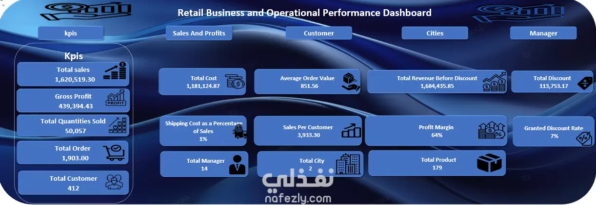 لوحة أداء الأعمال والتشغيل في قطاع التجزئة يتضمن المشروع خمس لوحات تفاعلية تم إنشاؤها باستخدام أدوات Microsoft Excel التالية: * Power Query * Power Pivot * Pivot Table تُبرز هذه اللوحات أهم مؤشرات الأداء الرئيسية (KPIs)، وتشمل: * جمالي المبيعات: 1,620,519.30 * إجمالي الأرباح: 439,394.43 * إجمالي الكمية المباعة: 50,057 بالإضافة إلى ذلك، توفر لوحات أخرى تحليلات أعمق، مثل: * معدل نمو المبيعات * أكثر المنتجات مبيعًا * العملاء الرئيسيون حسب حجم المشتريات * أداء المديرين، بما في ذلك تحديد المديرين الأعلى أداءً وتتبع الأرباح التي يساهم بها كل مدير في الشركة
