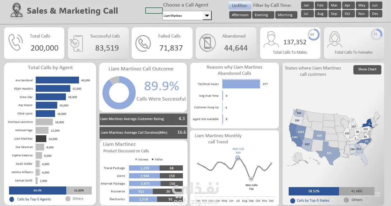 تم تطوير لوحة تحكم تفاعلية باستخدام Excel لتحليل وعرض بيانات أداء مركز الاتصالات. توفر اللوحة رؤى قابلة للتنفيذ حول إجمالي المكالمات، معدلات النجاح، المكالمات المتروكة، أداء الوكلاء، والبيانات الديموغرافية للعملاء. كما تمكّن المستخدمين من تصفية البيانات حسب وكيل المكالمات، وقت المكالمة، والشهر، مما يجعلها أداة ديناميكية وسهلة الاستخدام لاتخاذ القرارات.