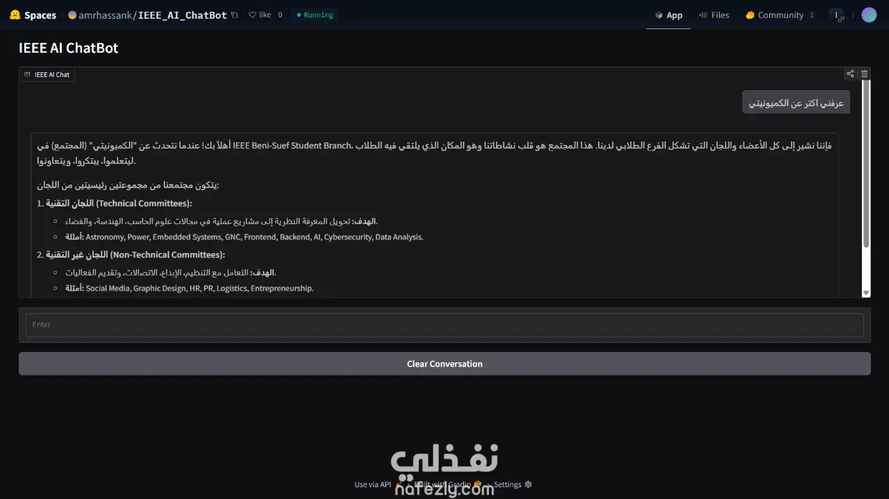 شات بوت لتسهيل الوصول للأعضاء الجدد بالنشاط، حيث انه يجيب على الإستفسارات الخاصة بهم ببيانات النشاط التي تم تدريبه عليها واستخراج المعلومات منها وتعديل توجيه رد الموديل ليناسب المطلوب للنشاط.