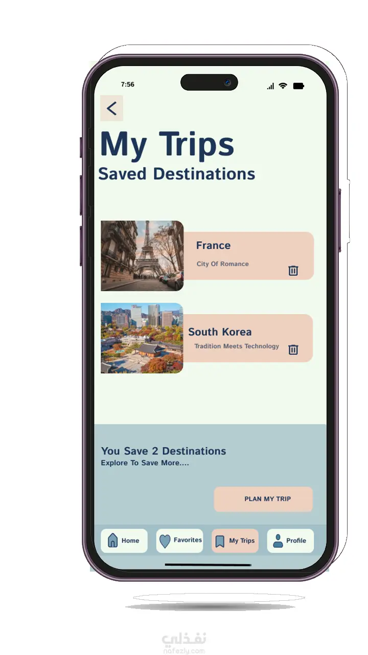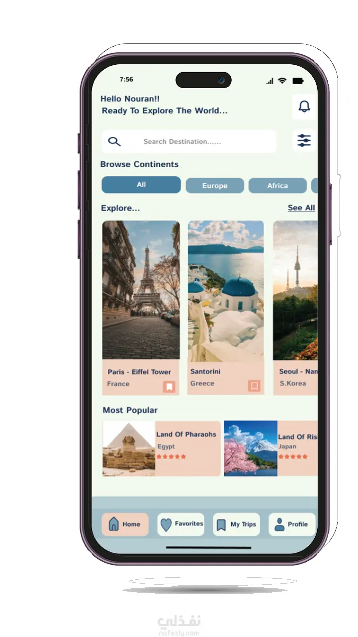 تطبيق موبايل بتصميم حديث وبسيط يساعد المستخدمين على استكشاف الوجهات السياحية، حجز الرحلات، وإدارة خططهم بسهولة. ركزت في التصميم على سهولة التنقل بين الشاشات، واستخدام ألوان مبهجة تعكس متعة السفر. شاشة رئيسية واضحة للوصول السريع إلى الوجهات والعروض. خطوات حجز مرتبة وبسيطة. تصميم نظيف وعصري يعزز تجربة المستخدم أثناء السفر.