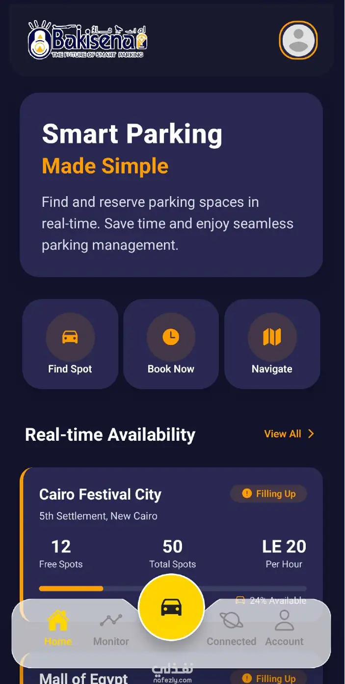 باكيسينا (Bakisena) هو تطبيق ذكي لإدارة مواقف السيارات، بيساعد المستخدمين يلاقوا ويـحجزوا أماكن الركن بسهولة وفي الوقت الحقيقي. التطبيق بيعرض المواقف القريبة مع حالتها (متاح أو ممتلئ) وسعر الساعة، وكمان بيتيح الحجز والملاحة للمكان مباشرة من خلال واجهة بسيطة وسهلة الاستخدام.
