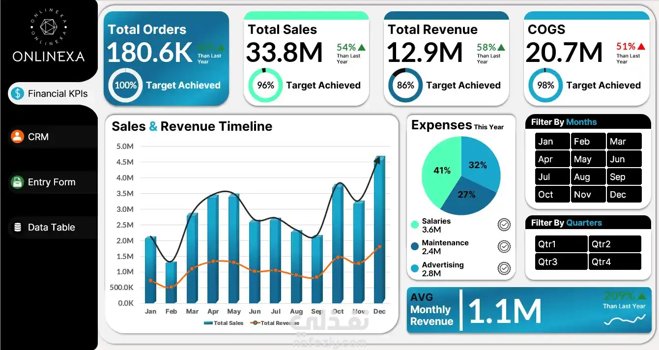 هذه اللوحة (Financial KPIs Dashboard) تُستخدم لتحليل ومتابعة أداء الشركة من حيث المبيعات والإيرادات والمصروفات