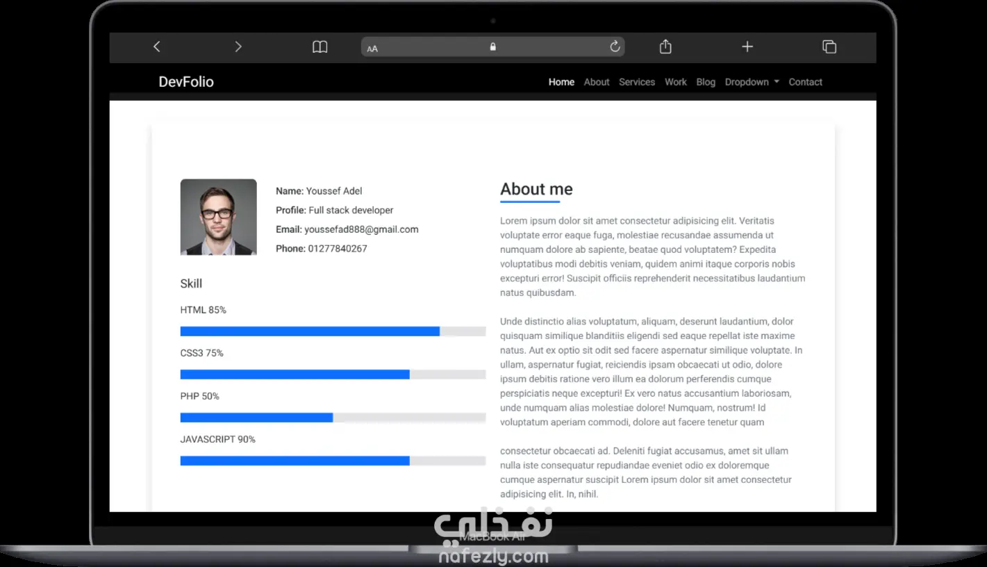 وصف المشروع مشروع بورتفوليو شخصي تمّ تصميمه وتطويره باستخدام HTML، CSS، وJavaScript، بهدف عرض المعلومات الشخصية والمهارات والمشاريع السابقة بطريقة احترافية وجذّابة. يحتوي الموقع على عدّة أقسام رئيسية: نبذة عني (About): يقدم لمحة سريعة عن المطوّر وشغفه بالمجال. التعليم (Education): يعرض الخلفية الأكاديمية والمؤهلات الدراسية. المهارات (Skills): يوضح التقنيات والأدوات التي يتقنها المطوّر. المشاريع (Projects): يستعرض مجموعة من الأعمال السابقة مع روابط مباشرة لها. التواصل (Contact): يتيح وسيلة سهلة للتواصل عبر البريد الإلكتروني أو وسائل التواصل الاجتماعي. تمّ التركيز في التصميم على البساطة، وسهولة التصفح، والتناسق البصري، مع مراعاة توافق الموقع مع مختلف الأجهزة (Responsive Design).