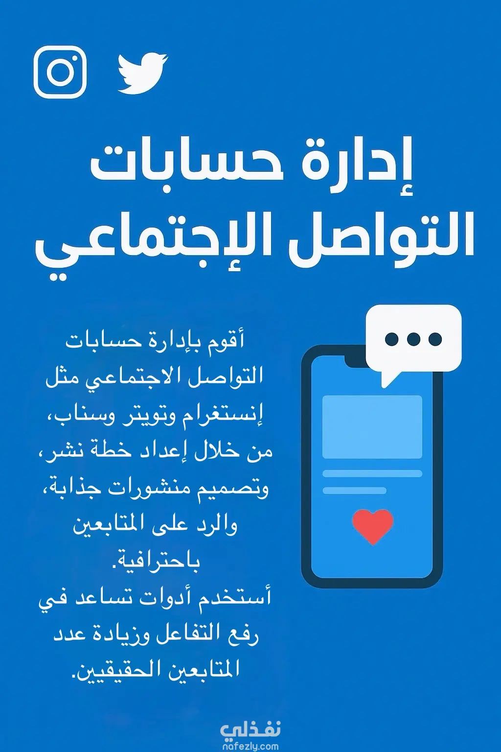 أقوم بإدارة حسابات التواصل الاجتماعي مثل إنستغرام وتويتر وسناب، من خلال إعداد خطة نشر، وتصميم منشورات جذابة، والرد على المتابعين باحترافية. أستخدم أدوات تساعد في رفع التفاعل وزيادة عدد المتابعين الحقيقيين.