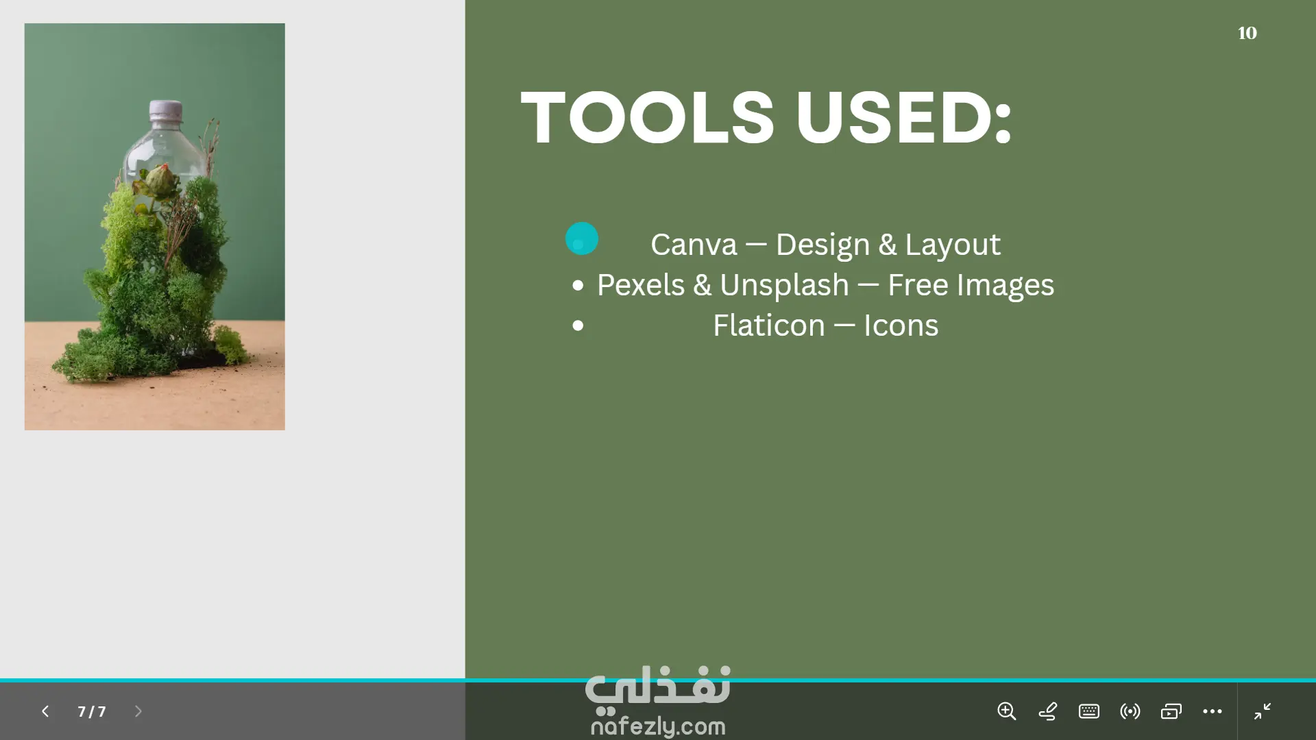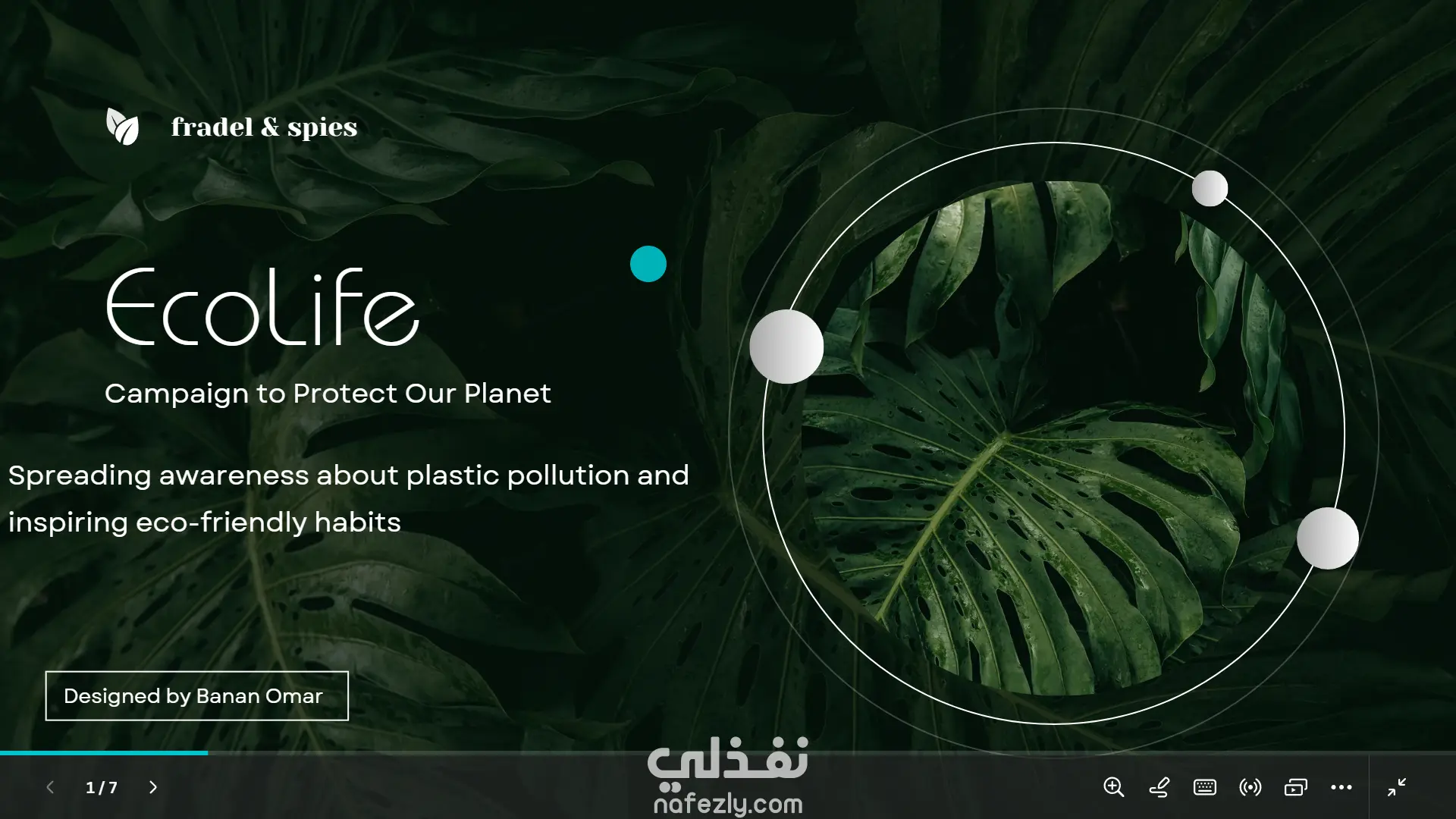مشروع EcoLife — Environmental Awareness Campaign هو عرض تقديمي قمتُ بتصميمه على Canva بهدف نشر الوعي حول أهمية الحفاظ على البيئة وتقليل استخدام البلاستيك.