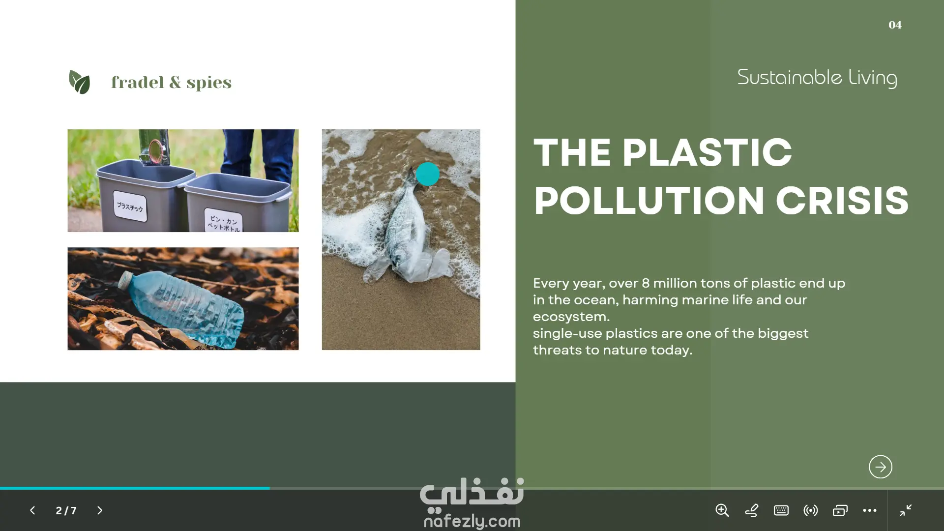 يضم التصميم مجموعة من السلايدات التي تشرح مشكلة التلوث البلاستيكي، وأهداف الحملة، والفئة المستهدفة، بالإضافة إلى دعوة للتحرك نحو أسلوب حياة أكثر استدامة.