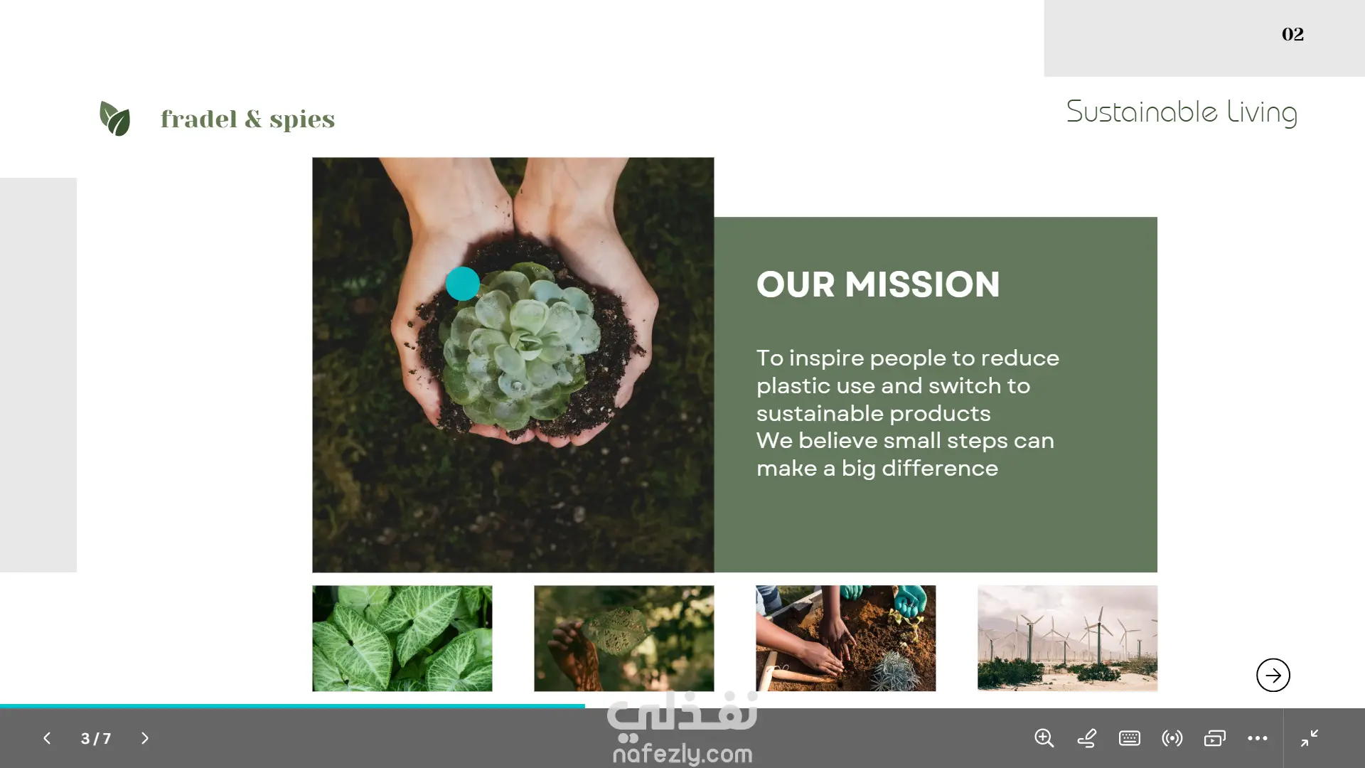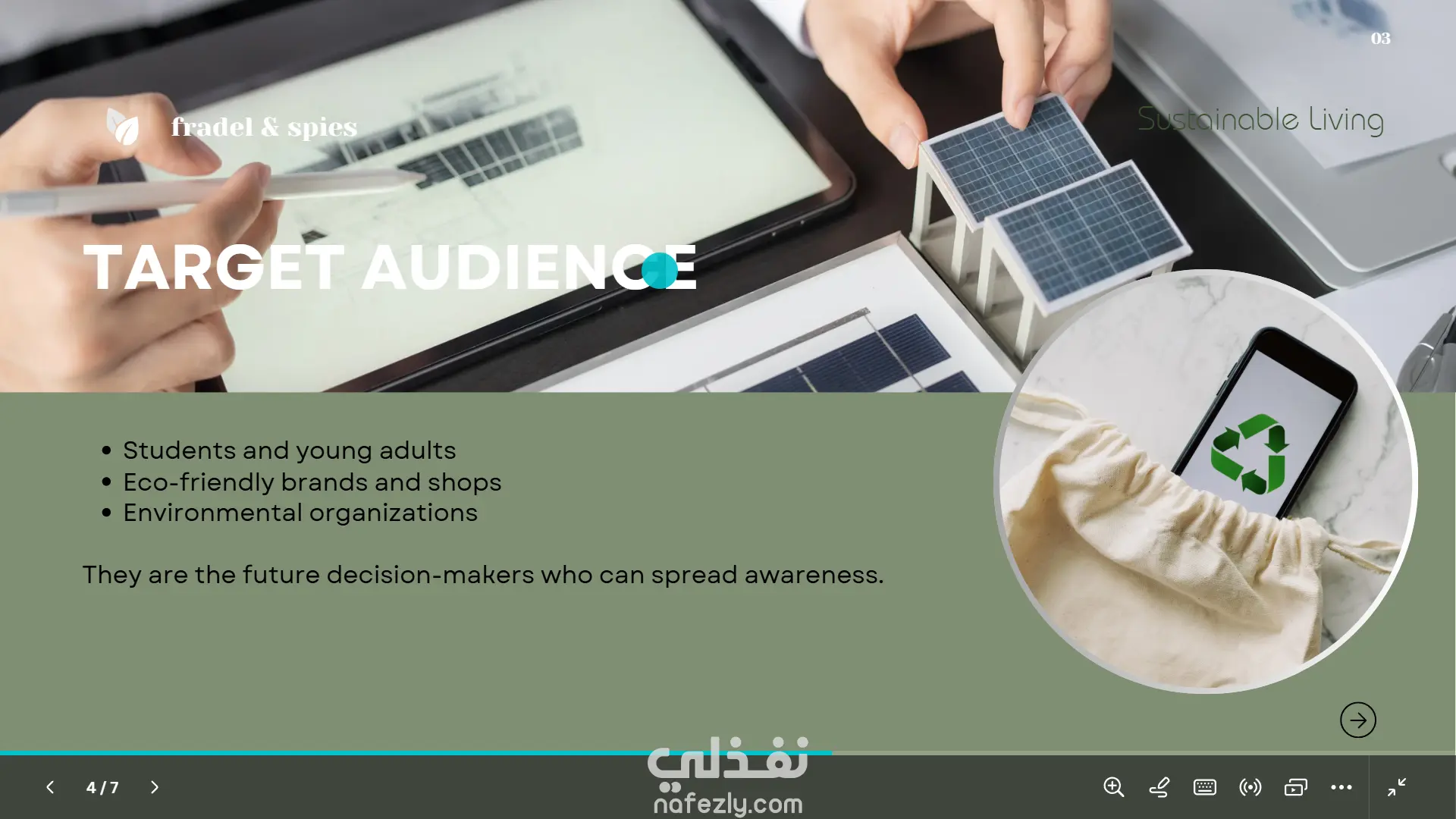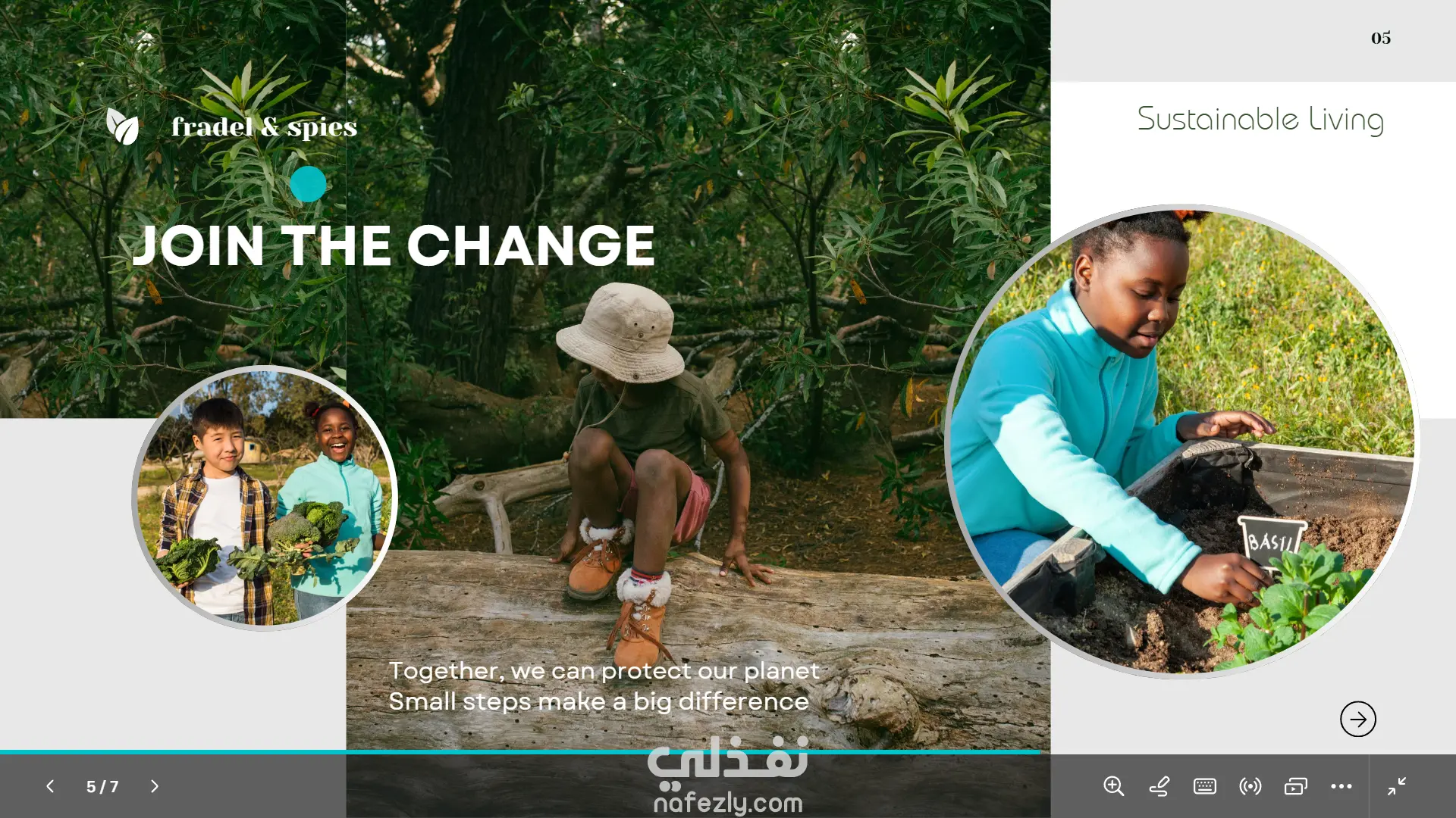 يعرض البرزنتيشن فكرة حملة توعوية بطريقة عصرية وبألوان مستوحاة من الطبيعة لخلق إحساس بالهدوء والاستدامة.