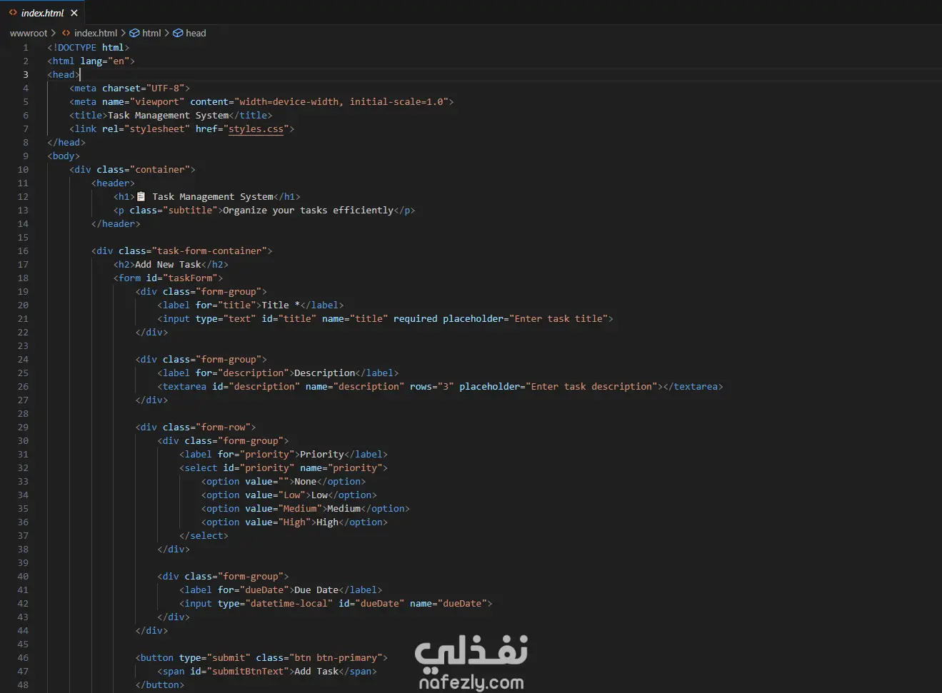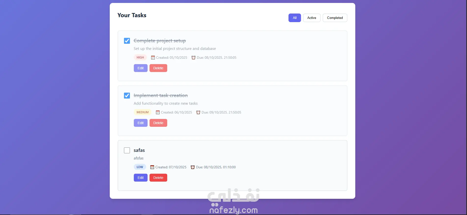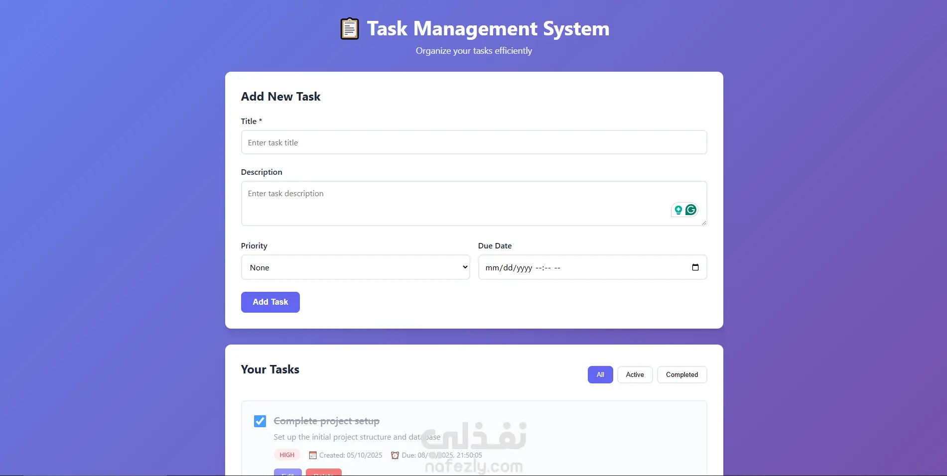 مشروع واجهة نظام إدارة مهام (Task Management System Front-End) هو تطبيق ويب تفاعلي تم تطويره باستخدام HTML وCSS وJavaScript لتمكين المستخدمين من إدارة مهامهم اليومية بسهولة. يمكن للمستخدم إضافة المهام وتحديد الأولوية وتاريخ الاستحقاق، بالإضافة إلى تعديل المهام أو حذفها، مع إمكانية تحديد حالة كل مهمة (مكتملة أو نشطة). الواجهة مصممة لتكون بسيطة وسلسة في الاستخدام، مع دعم فلترة المهام حسب الحالة (الكل، النشطة، المكتملة)، ويتم تحديث البيانات بشكل فوري من خلال الاتصال بـ RESTful API خاص بالخادم الخلفي. المشروع مناسب كجزء من نظام متكامل لإدارة المهام أو كنموذج لتطبيقات CRUD تفاعلية في الويب.