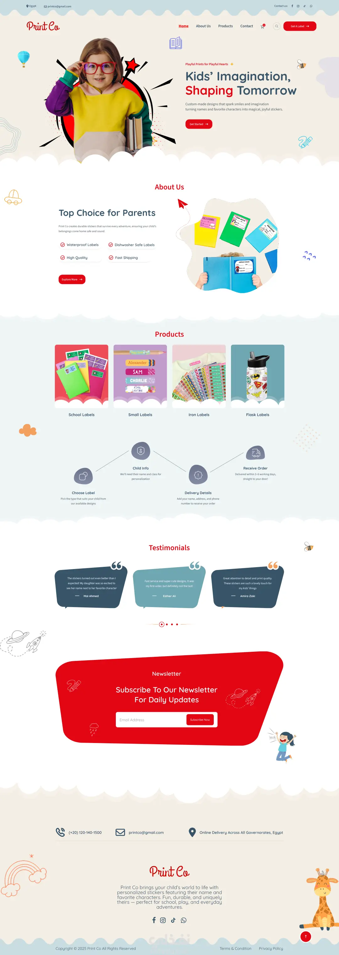 برينت كو هي منصة لتصميم الملصقات المخصصة للأطفال، تتيح للآباء تخصيص الملصقات باسم طفلهم وشخصياته الكرتونية المفضلة. صممت واجهة مرحة وسهلة الاستخدام تتيح للمستخدمين معاينة وتخصيص الملصقات بسهولة. شمل دوري إنشاء نظام تصميم متكامل، وبناء مكونات قابلة لإعادة الاستخدام، وتقديم نموذج تفاعلي يوضح تجربة التخصيص الكاملة على فيجما.