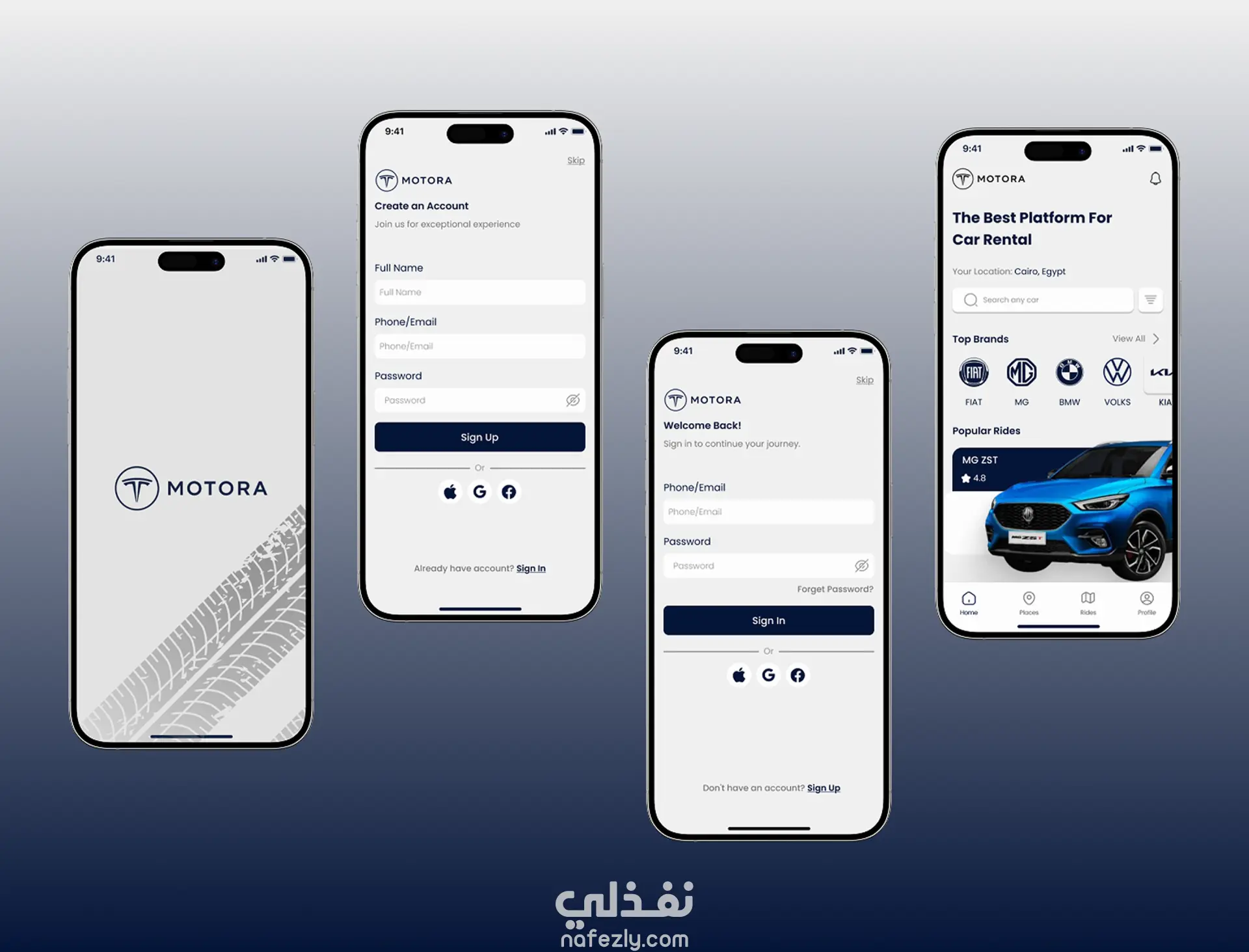 موتورا هو تطبيق للهاتف المحمول صُمم لتبسيط تجربة تأجير السيارات للمستخدمين. عملت على إنشاء واجهة عصرية ونظيفة تركز على سهولة الاستخدام والتنقل السلس. شمل التصميم النقاط الأساسية في التطبيق، بدءًا من شاشة البداية مرورًا بتدفقات تسجيل الدخول والتسجيل، وصولًا إلى الصفحة الرئيسية حيث يمكن للمستخدمين تصفح السيارات وحجزها بسهولة.