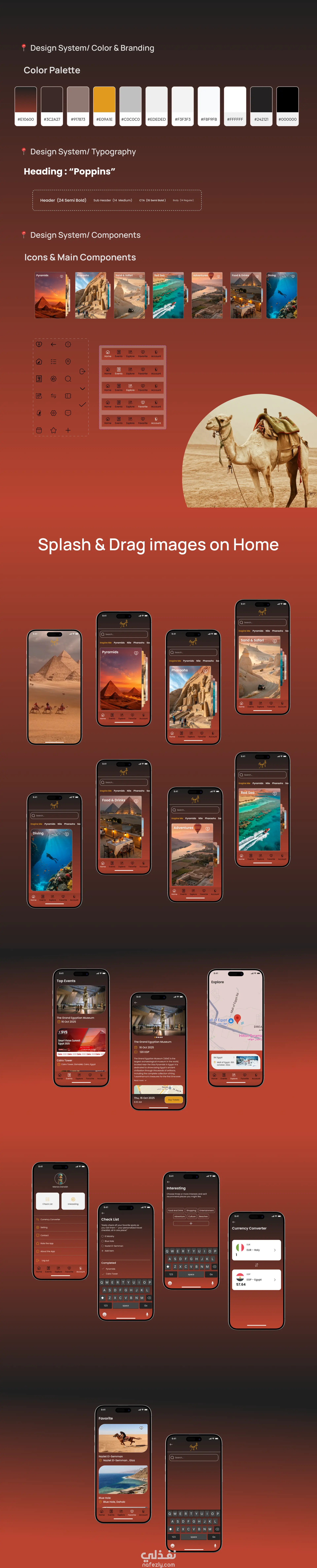 فيزيت إيجيبت هو تطبيق سياحي للهواتف المحمولة يعرض ثقافة مصر ومعالمها من خلال صور غامرة وتنقل واضح وسلس. صممت مكونات قابلة لإعادة الاستخدام، ونظام تصميم متناسق، ونموذجًا تفاعليًا يوضح تدفقات المستخدم داخل التطبيق. تجمع كل فئة (المغامرات، البحر الأحمر، النيل، المأكولات، المتاحف، الفراعنة) بين الصور والنصوص لتقديم تجربة ملهمة وسهلة الاستخدام.