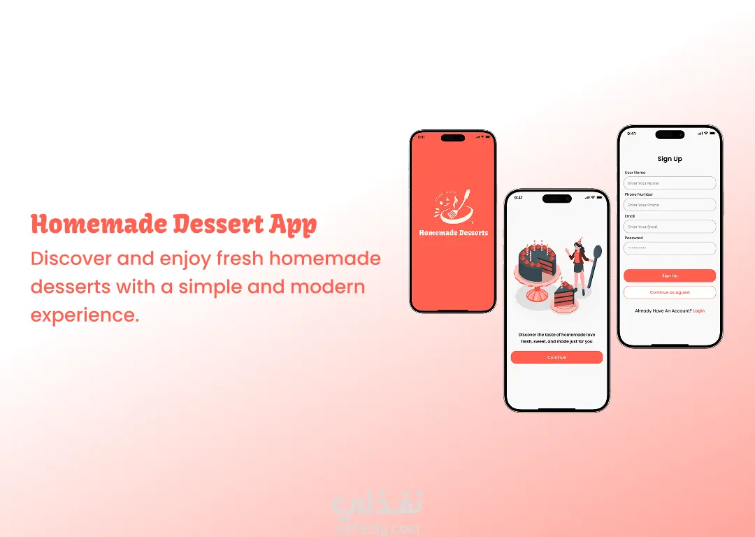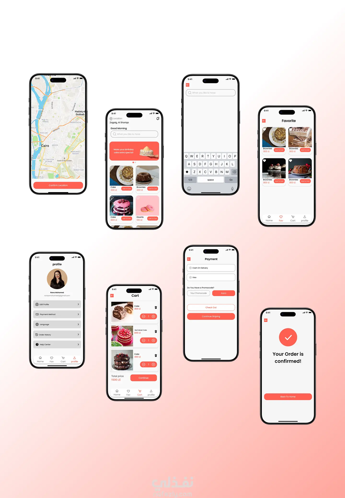 صميم تطبيق موبايل متكامل لتوصيل وطلب الحلويات المنزلية، مع التركيز على تحسين تجربة المستخدم من أول دخول التطبيق وحتى إتمام عملية الشراء. التطبيق يتكون من عدة شاشات مترابطة: شاشة البداية والترحيب. صفحات تسجيل الدخول والتسجيل. خريطة لتحديد موقع المستخدم. واجهة رئيسية لعرض المنتجات بشكل منظم. خاصية البحث وإضافة المنتجات إلى المفضلة. إدارة عربة التسوق والدفع الإلكتروني. صفحة لتأكيد الطلب بعد الدفع. صفحة الملف الشخصي لإدارة بيانات المستخدم. الهدف من التصميم هو توفير رحلة مستخدم بسيطة وسريعة مع واجهة عصرية وألوان متناسقة، مما يسهل على العملاء الوصول إلى طلباتهم بخطوات قليلة.