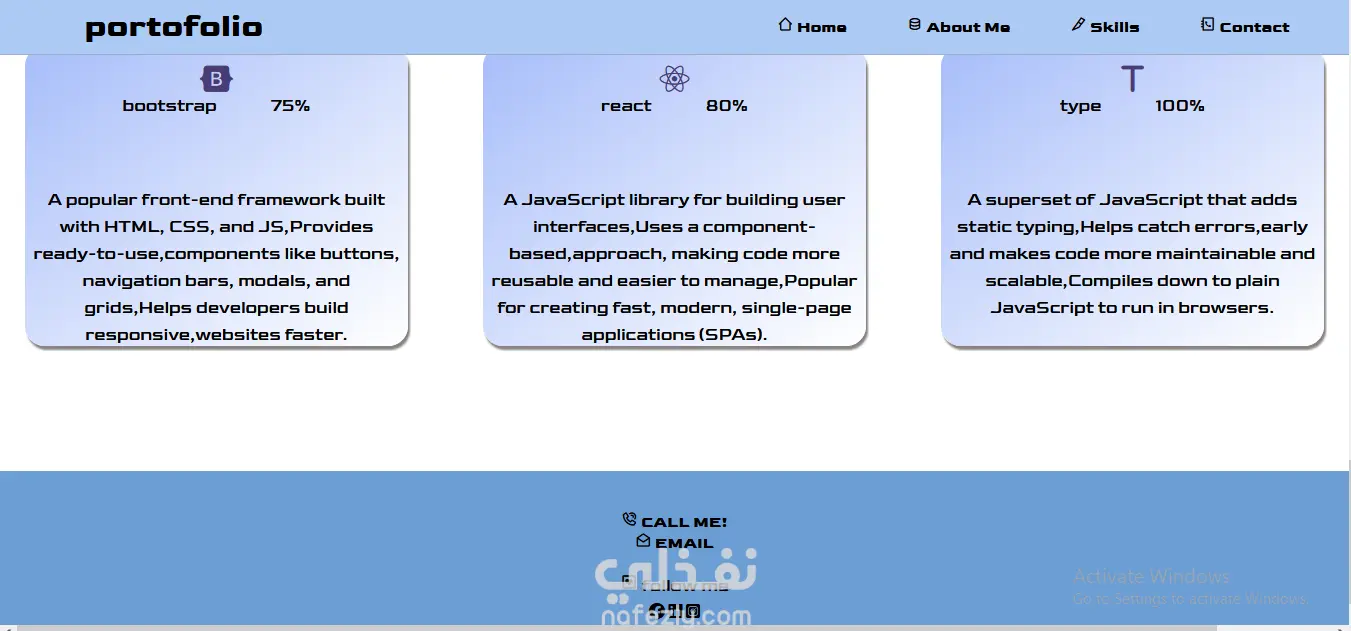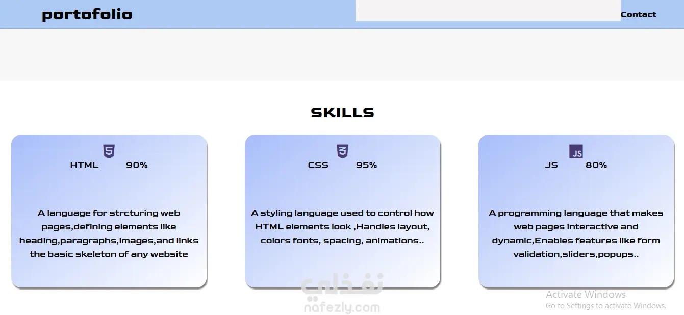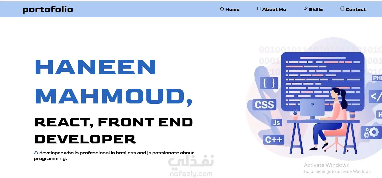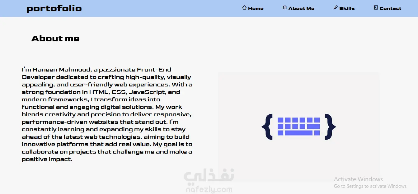 personal portofolio contains main page with big font and a personal photo a page contains skills page for my projects and a contact section all using html,css,js