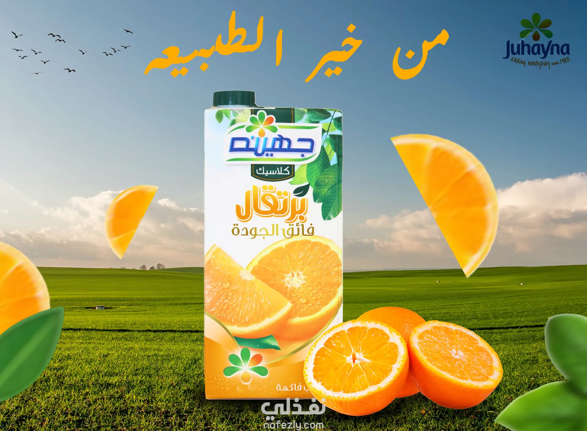 الخدمة المقدمة: تصميم إعلان لمنتج غذائي. الهدف: إنشاء أصل إعلاني جذاب بصريًا يركز على جودة ونقاء عصير البرتقال الكلاسيك من جهينة، وتوصيل رسالة أن المنتج مستخلص "من خير الطبيعة". المهارات الموظفة تصميم وتكوين المشهد (Composition): ترتيب العناصر (العبوة، الفاكهة، الخلفية الطبيعية) لضمان التركيز البصري على المنتج وإيصال الشعور بالانتعاش. الدمج والمعالجة الرقمية (Digital Compositing): دمج صور عالية الجودة للعبوة والبرتقال والأرض الخضراء في بيئة واحدة بشكل واقعي واحترافي باستخدام تقنيات الفوتوشوب المتقدمة. إدارة الألوان والإضاءة (Color & Lighting): ضبط الإضاءة والألوان لتكون زاهية وحيوية، مما يعزز جاذبية العصير ويؤكد على نضارة الفاكهة. التصميم الإعلاني: التأكد من وضوح الشعار والرسالة التسويقية ("من خير الطبيعة") لتعزيز العلامة التجارية.